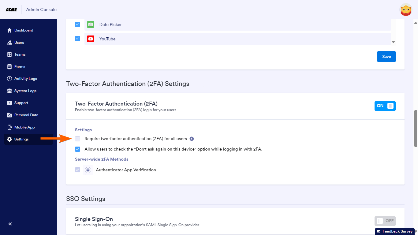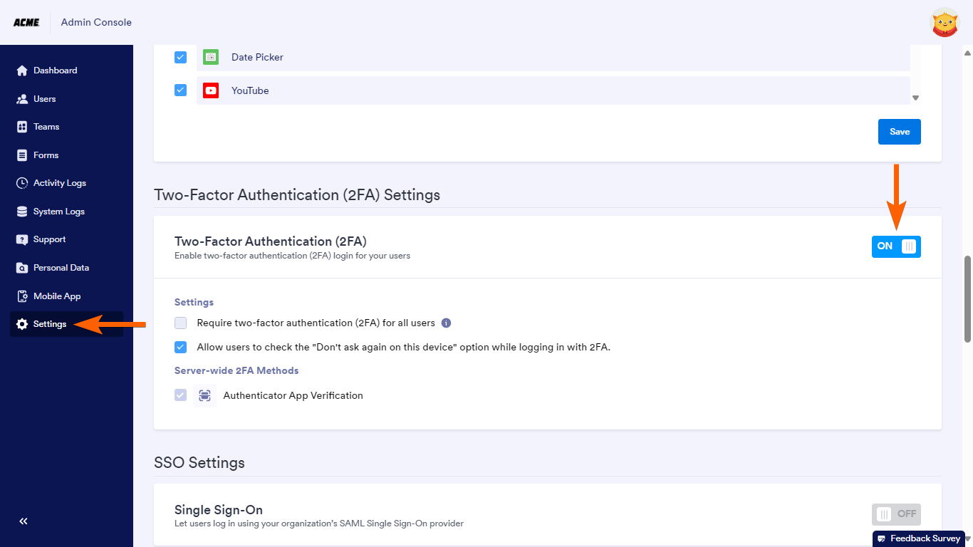 To enable 2FA on your Jotform Enterprise server