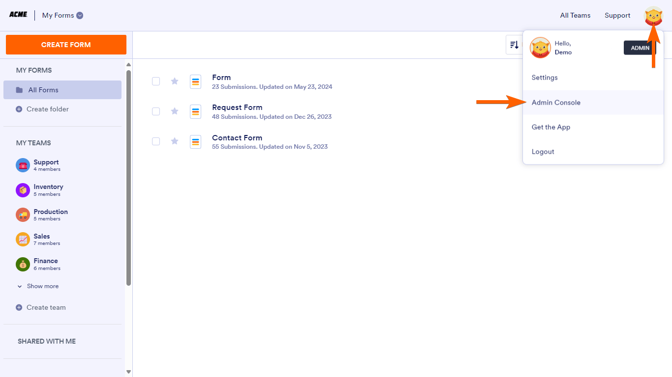 - Select Admin Console from the menu.