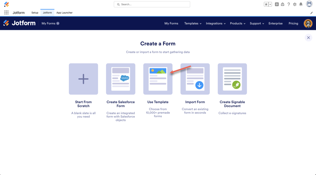 Before selecting a work order template, make sure you’ve added Jotform from the Salesforce AppExchange. Then click the Create Form button and Use Template. When you’re using Jotform for Salesforce, you’ll automatically be brought to Salesforce Forms.