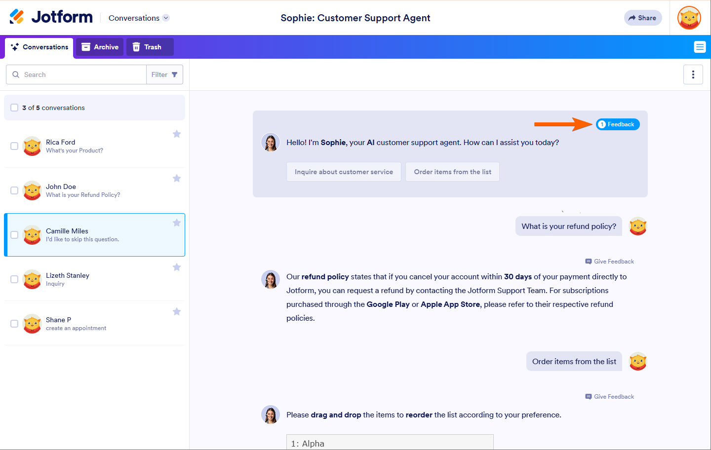 Giving feedback on AI agent responses is crucial for improving their accuracy and effectiveness. By rating responses and providing comments, you help refine the AI’s performance and ensure better interactions in the future.