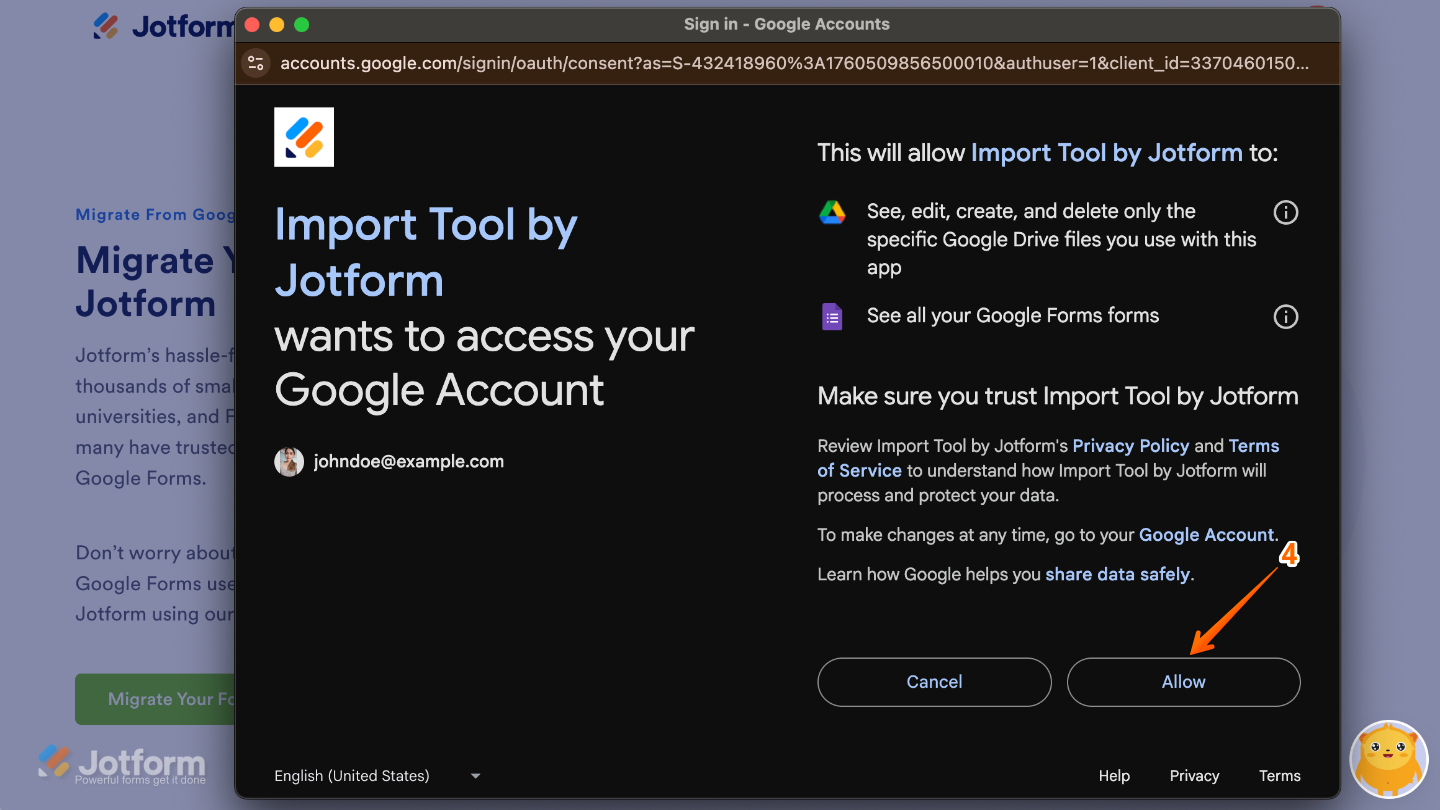 - Next, log in to your Google account, and be sure to check all permissions when prompted. Then, click on Allow to continue.
