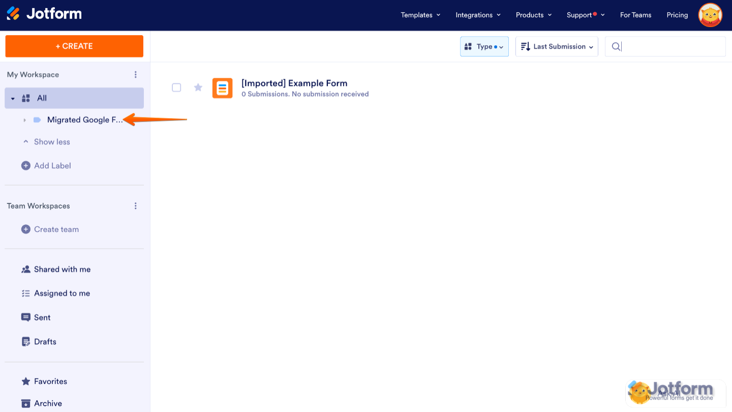As part of the import process, Jotform will automatically create a new folder called Migrated Google Forms to keep all your imported forms neatly organized. Each form will also have the prefix Imported added to its title, so you can easily spot which ones came from Google Forms. Of course, you can rename them anytime to fit the naming style you want to use.
