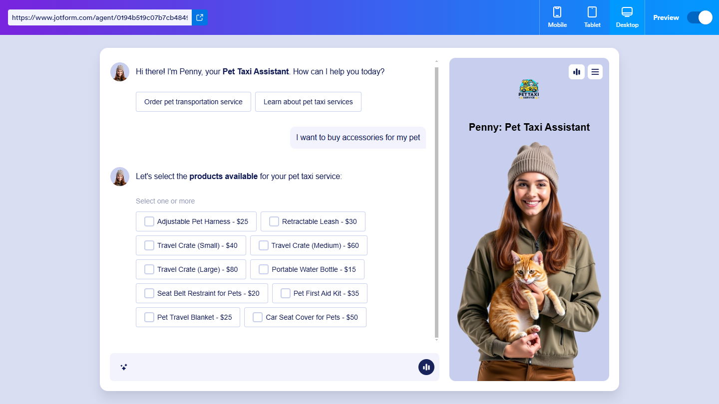 In the conversation, the agent helped the user fill out the form, which is linked to the workflow set in the action saved in the example above.