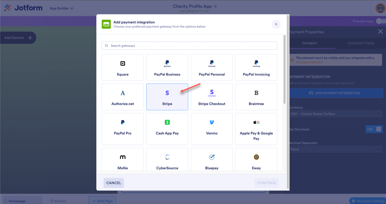 Your donation element will not be visible to your donors until you’ve set up a payment integration. With a Donation box element, you have over 30 payment gateways to choose from. So you’re bound to find one that works for you. Keep on reading to learn how to integrate your donation app with your favorite payment gateway.