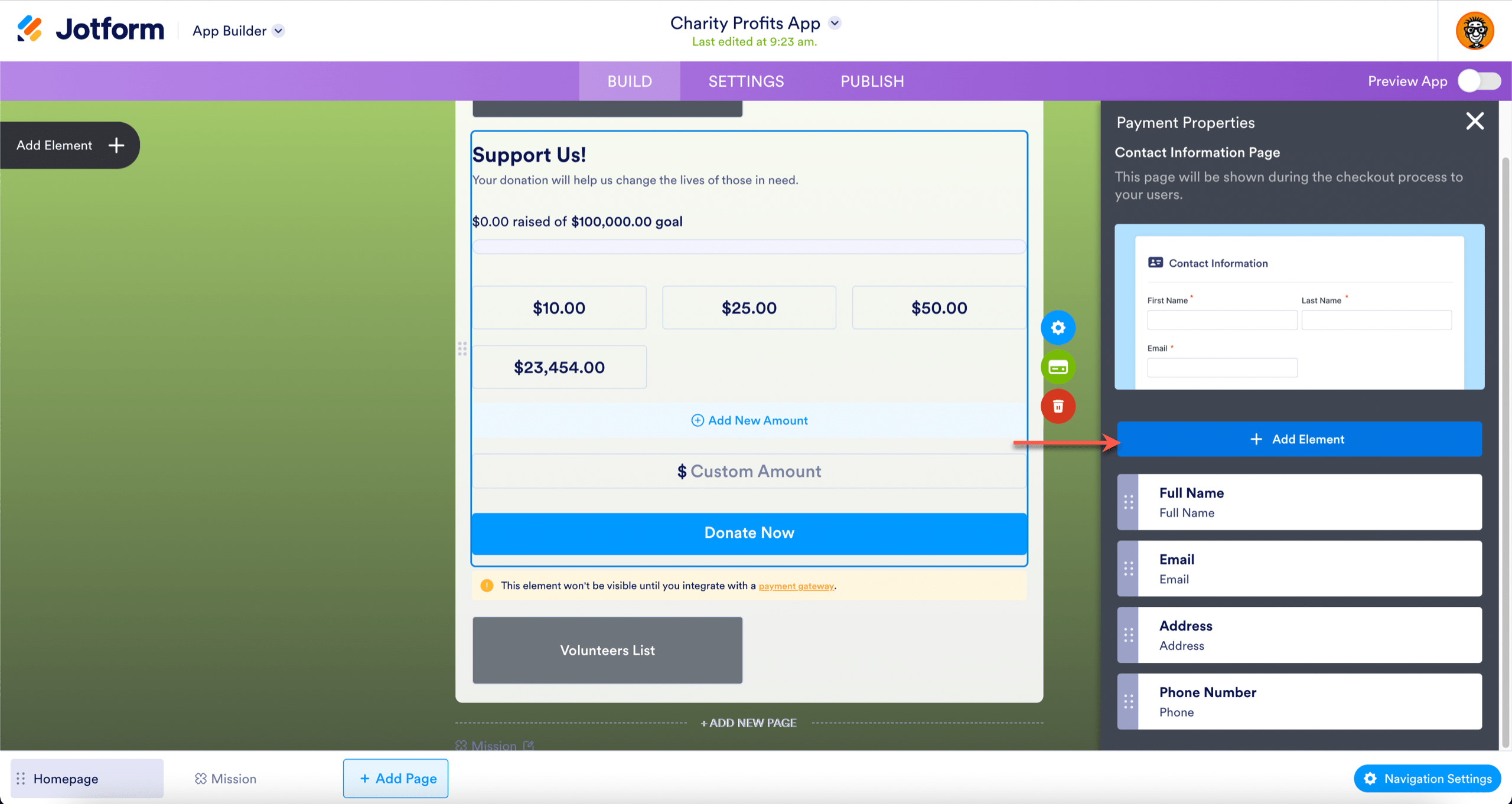 - In the Checkout Page tab, you can personalize the contact information you want to collect from your donors. They’re all optional, except for the full name and email elements. Click the Add Element button to add different contact elements.
