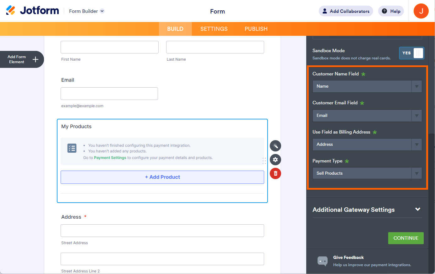 - If you choose Sell Products from the Payment Type, click the Continue button to add your product items. If you select User Defined Amount or Donation, click the Save button to complete the integration.