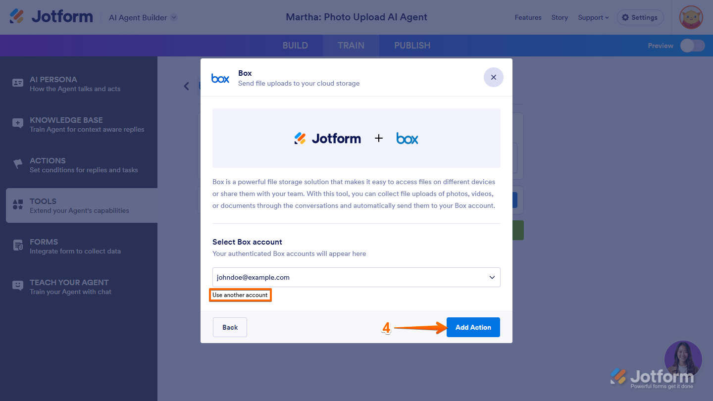 - In the Box modal window, choose an email address from the dropdown to use a saved Box account and click on the Add Action button on the right, or click on Use Another Account below the dropdown to log in and grant the integration access to a different Box account.