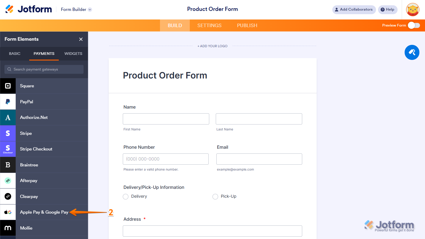 - Now, in the Form Elements menu, under the Payments tab, click on Apple Pay & Google Pay to add it to your form.