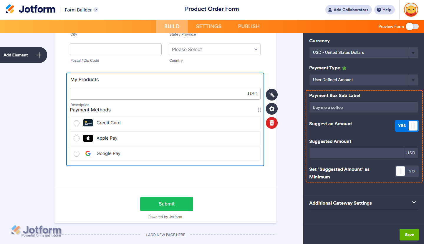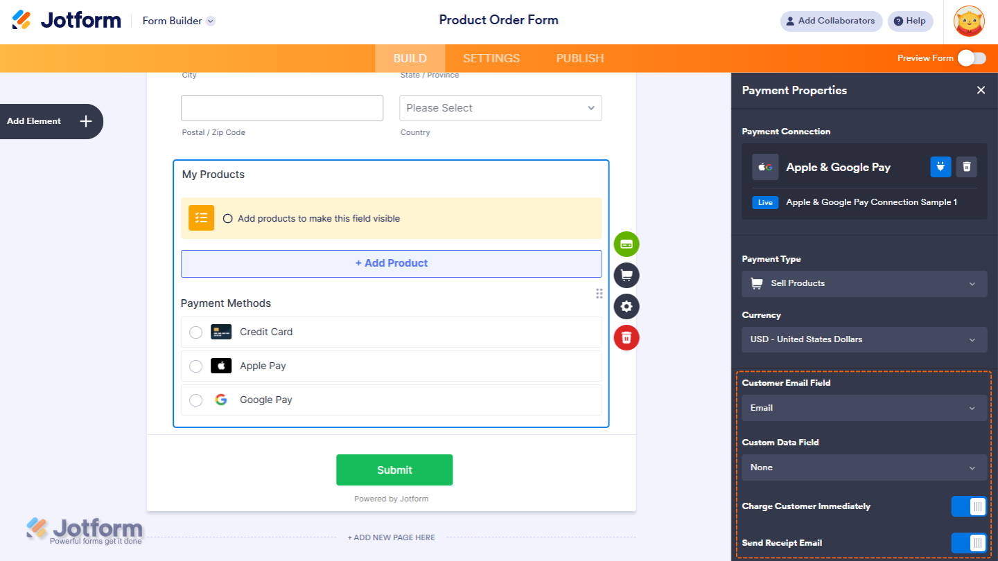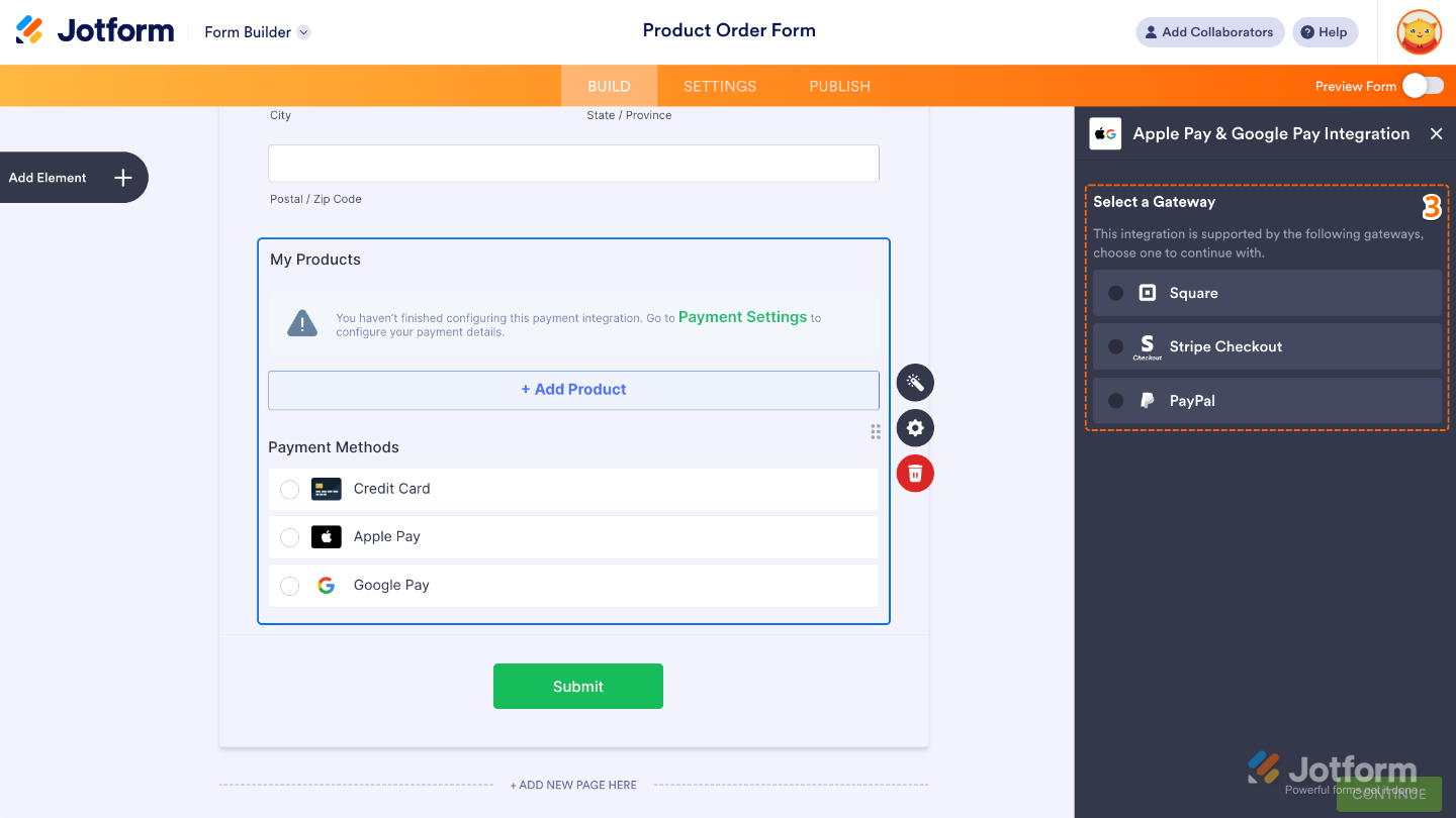 With Jotform, you can accept payments with Apple Pay & Google Pay by connecting a supported provider such as Stripe Checkout, PayPal, or Square. This setup gives your users a faster and easier way to pay through your form, even without a direct integration.