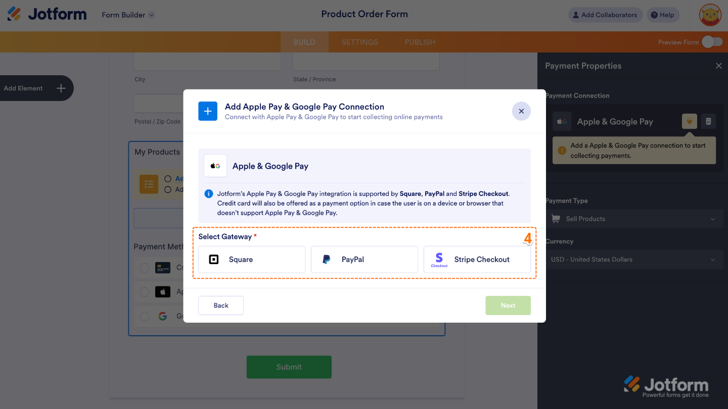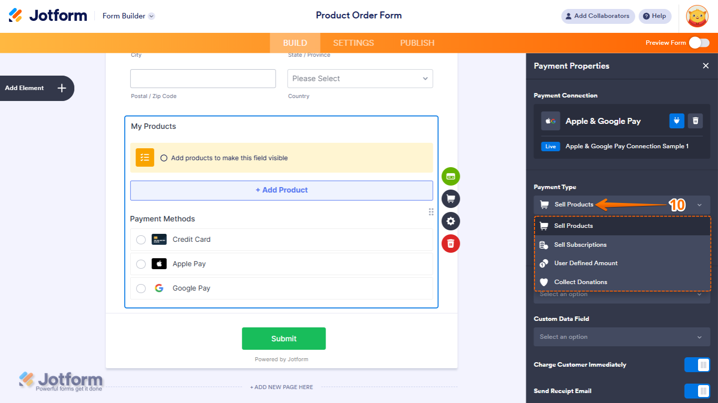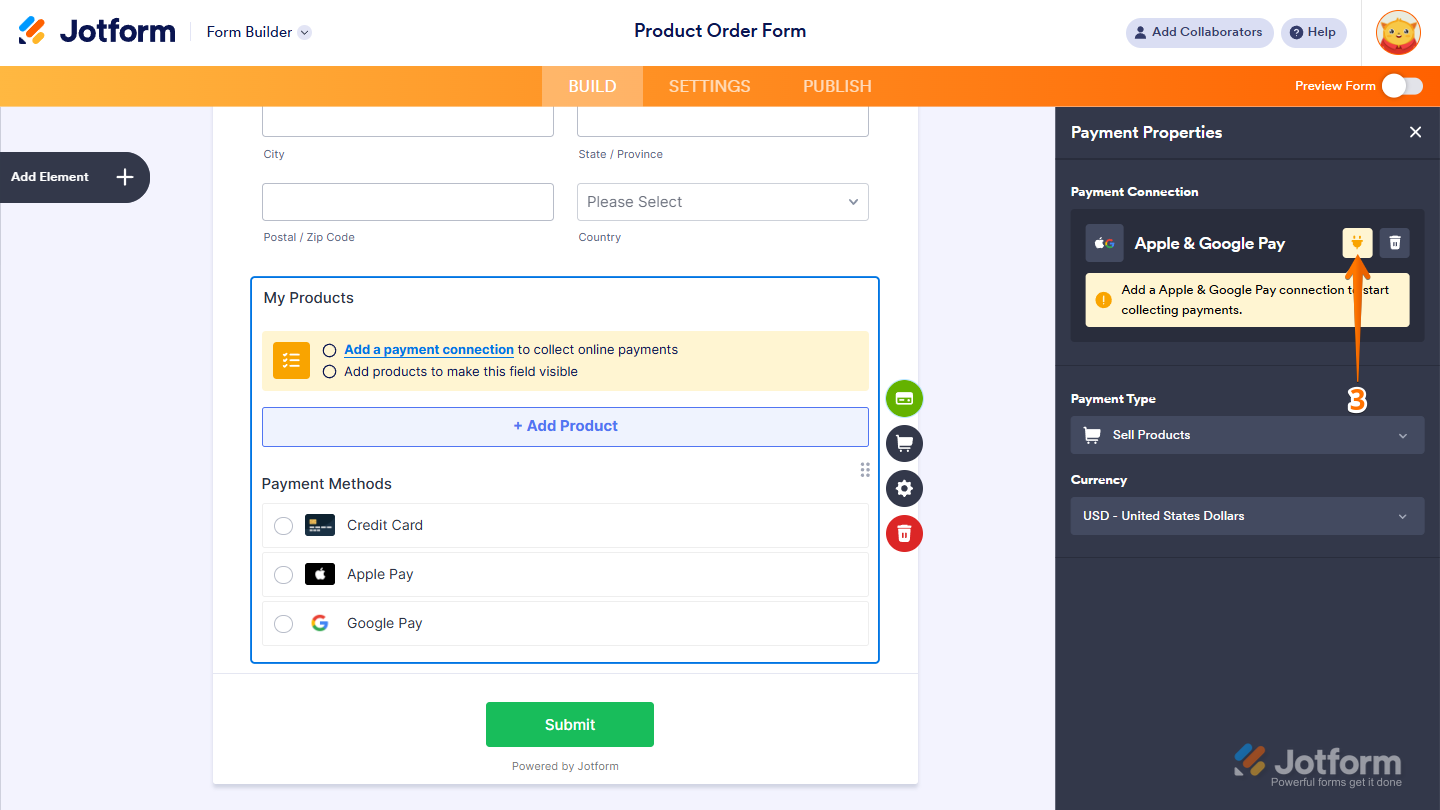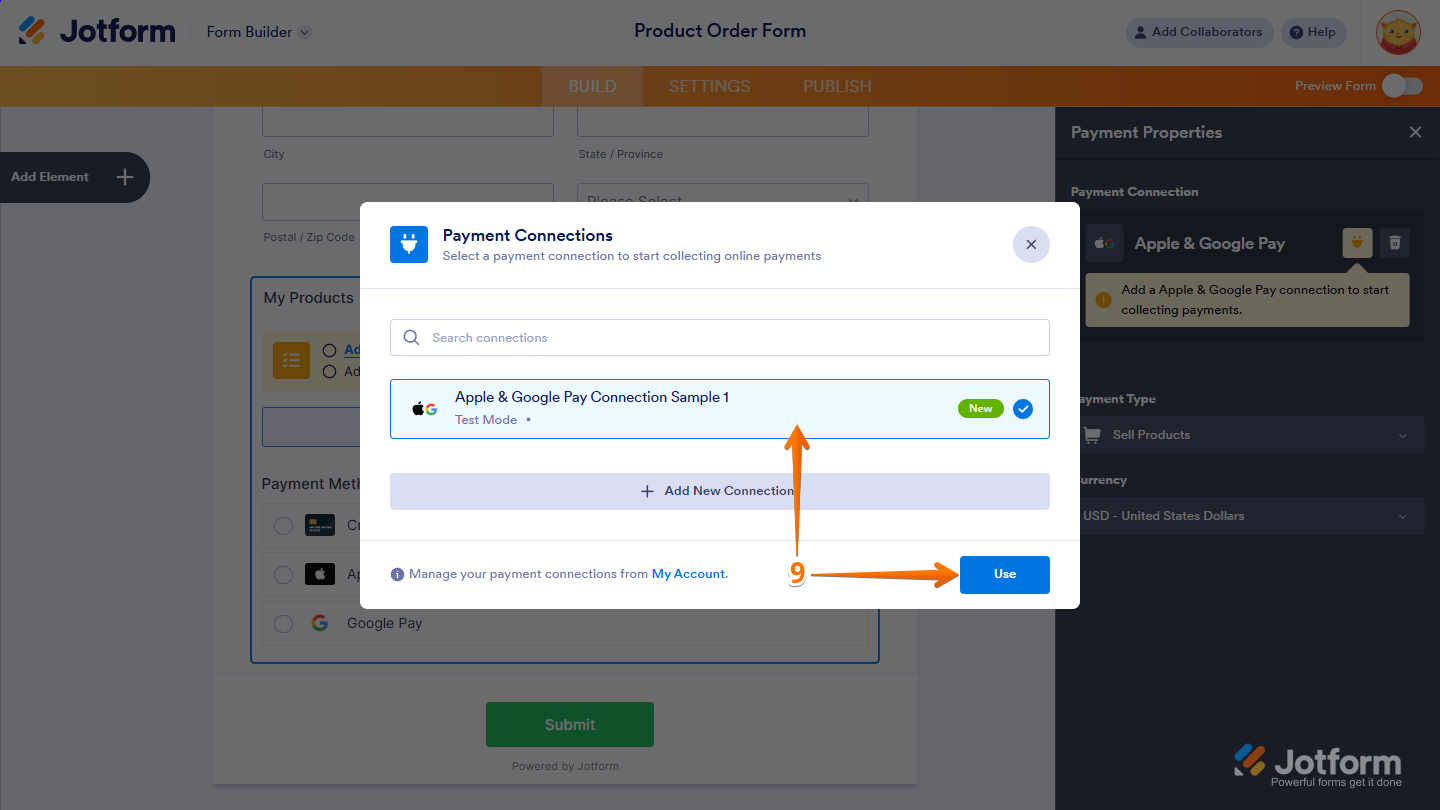 With Jotform’s Reusable Payment Connections feature, you can set up payment integrations like Apple Pay & Google Pay and reuse the same configuration on your other forms without needing to configure it again. To get going, here’s what you’ll do: