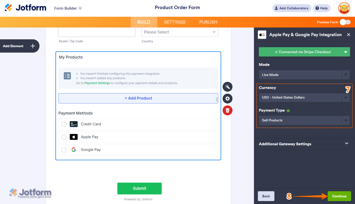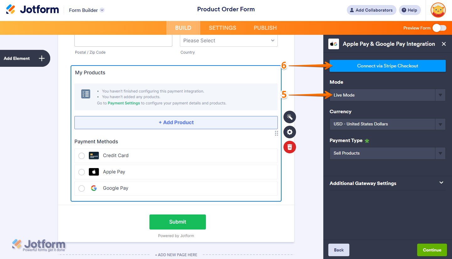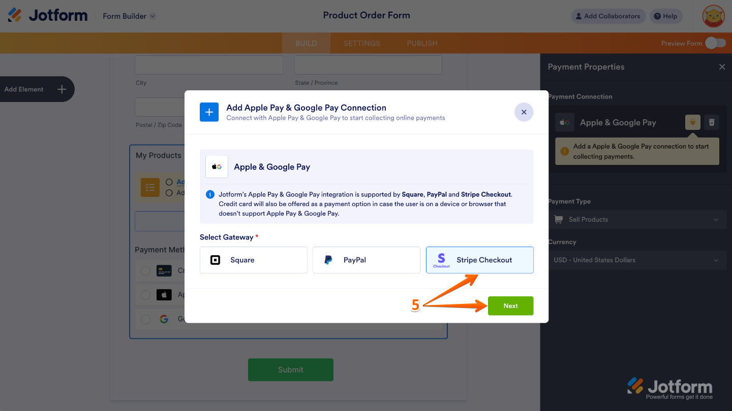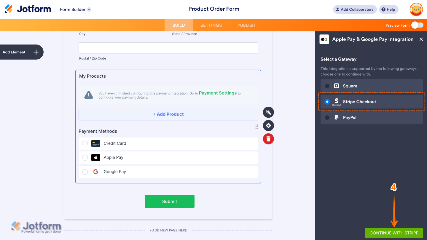 - If you chose Stripe Checkout, you’ll see options for Credit Card, Apple Pay, and Google Pay in Form Builder. But these options won’t appear directly on your form. Instead, they’ll show up on the Stripe Checkout Payment page depending on these requirements mentioned below.