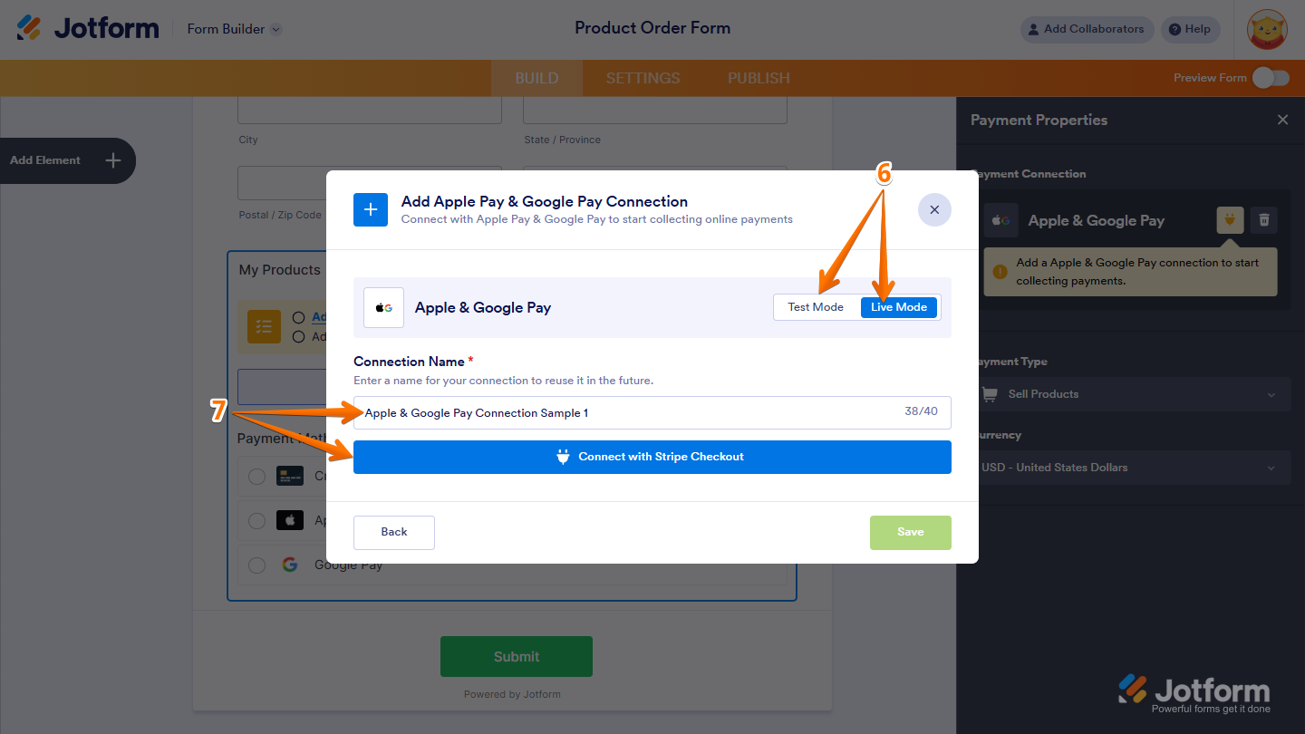 - Now, in the Apple Pay & Google Pay window, click on either Test Mode or Live Mode at the top to select the environment for your payment connection.