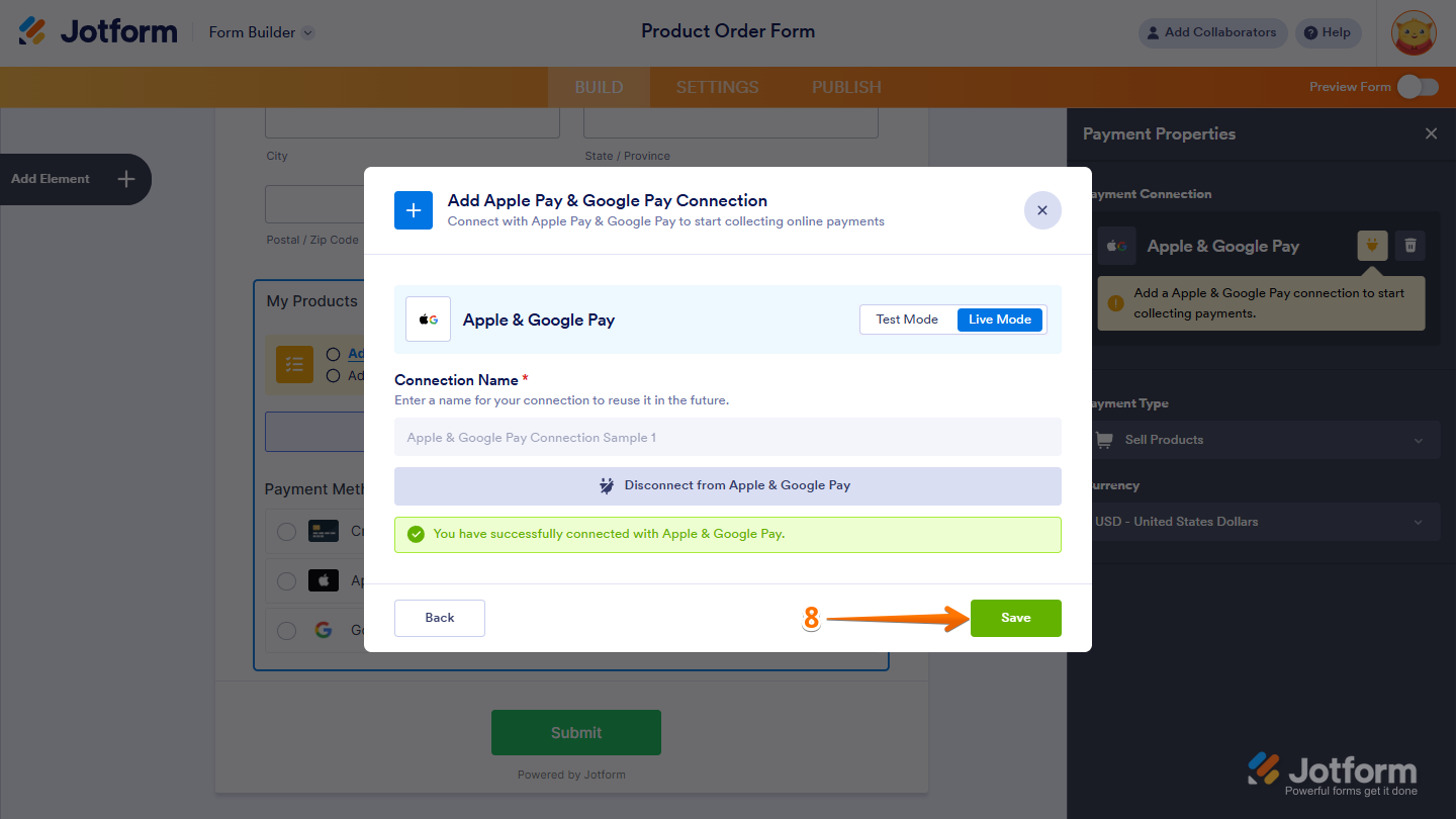 And you’re all set! You’ve successfully set up your Apple Pay & Google Pay Reusable Payment Connection. Now, you can use this same configuration on any other form or app you create. Explore our guide on How to Add and Manage Reusable Payment Connections to dive in deeper.