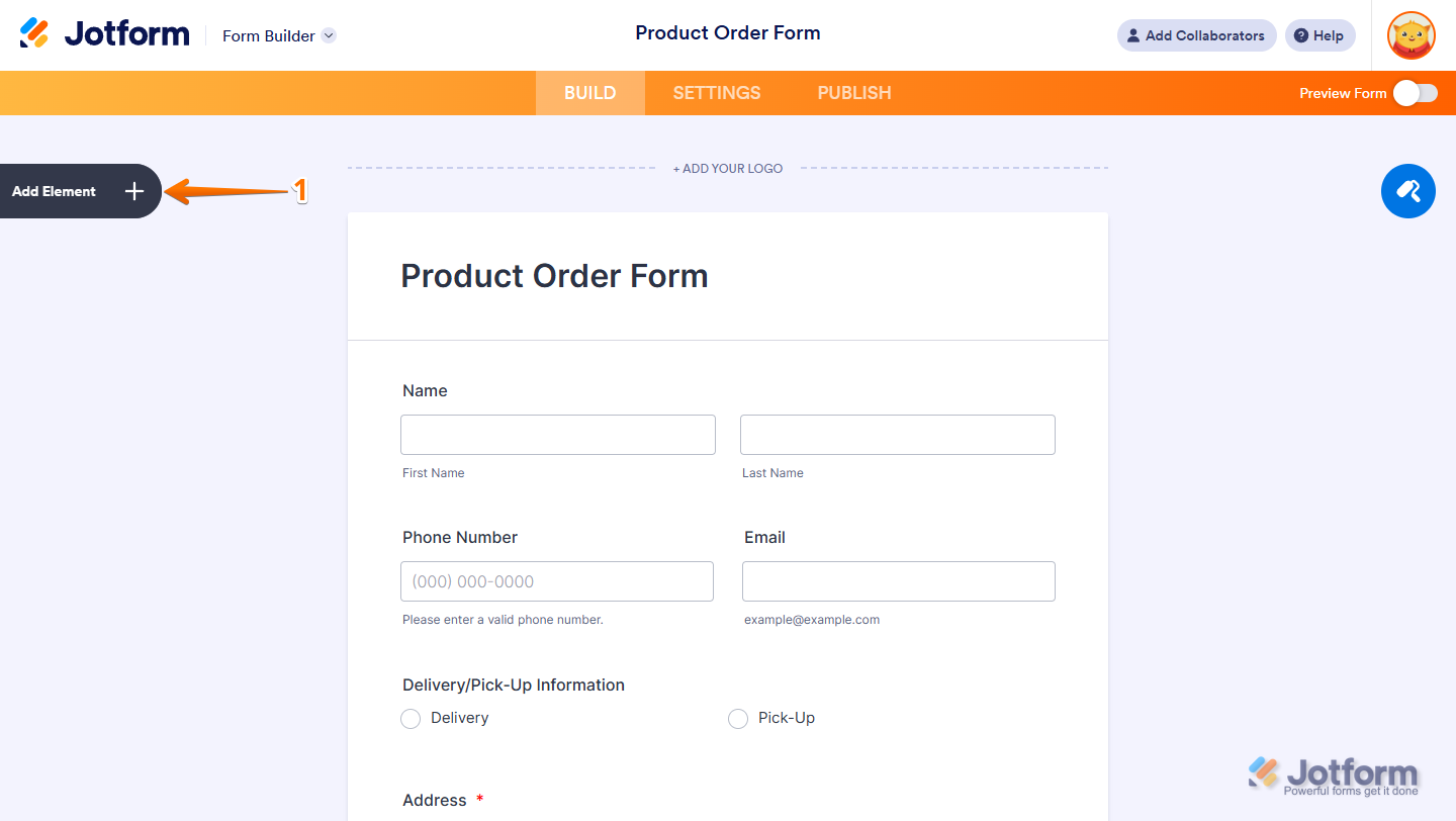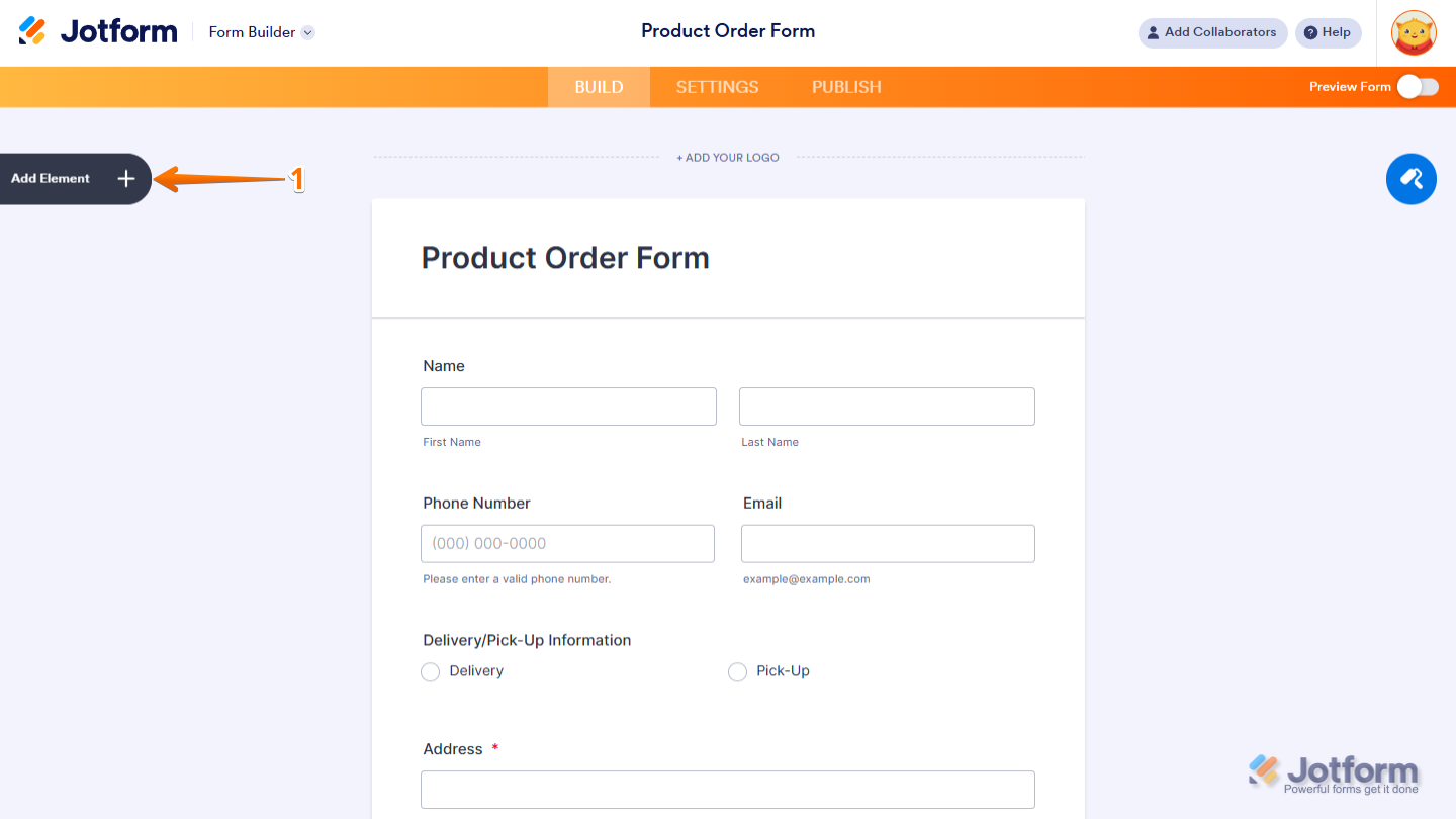 - In Form Builder, click on Add Element on the left side of the page.