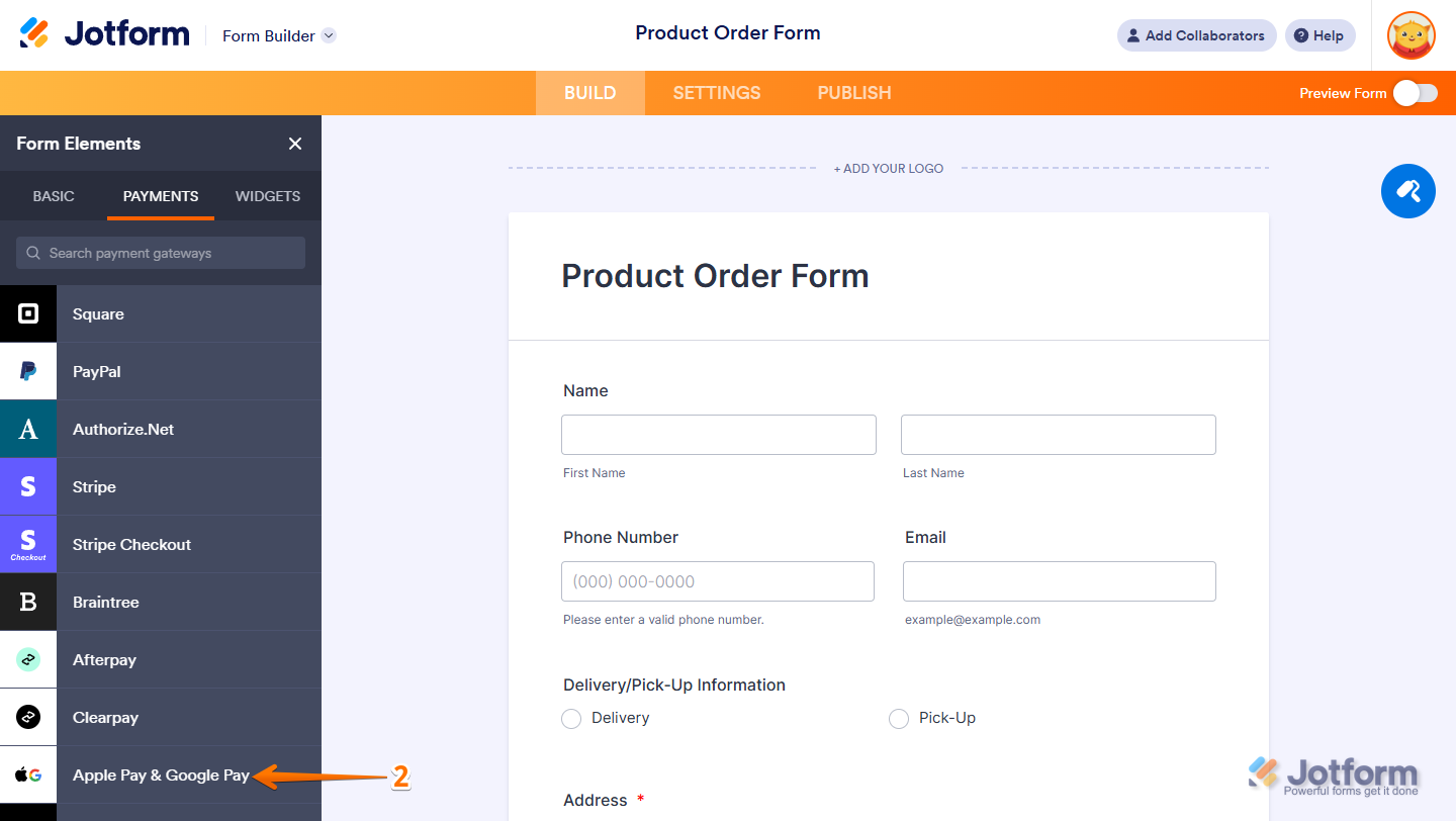 - PayPal — Link your PayPal account so you can start accepting Apple Pay & Google Pay right from your form.