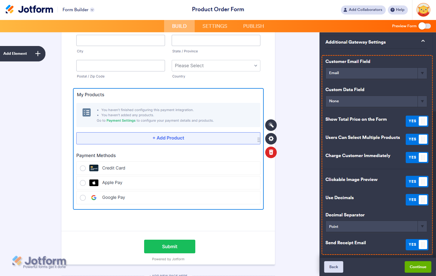 - Once everything’s set for the Sell Products and Sell Subscriptions payment types, click on Continue to start creating products and subscriptions for your payment field. For the User Defined Amount and Collect Donations payment types, just click on Save at the bottom.