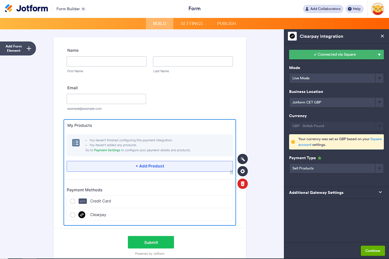 Clearpay is available in Jotform Payments. Powered by Square, integrate it into your form to accept installments.
