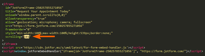 - Update the value of the scrolling attribute in the iframe to yes when you paste it into your code editor to embed your form on your website.