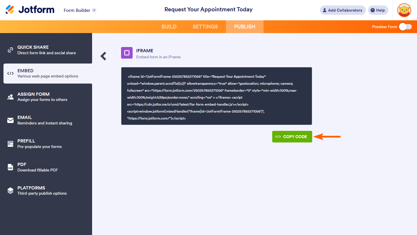 Jotform can automatically adjust your form’s height based on the embed method you use, ensuring it fits seamlessly into your webpage. However, if your embedded form uses a custom height and requires a scrollbar for proper display, the iframe embed option allows you to enable scrolling effectively.