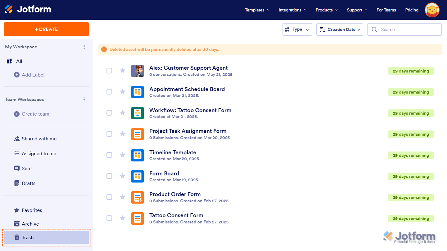 Keeping your workspace organized includes properly handling deleted assets. When you delete an asset, it moves to the Trash folder, where it stays for 30 days before being permanently removed. Until then, you can restore it if needed or purge it for immediate, permanent removal. Check out the steps below to see how to delete, restore, and permanently remove assets from your workspace.