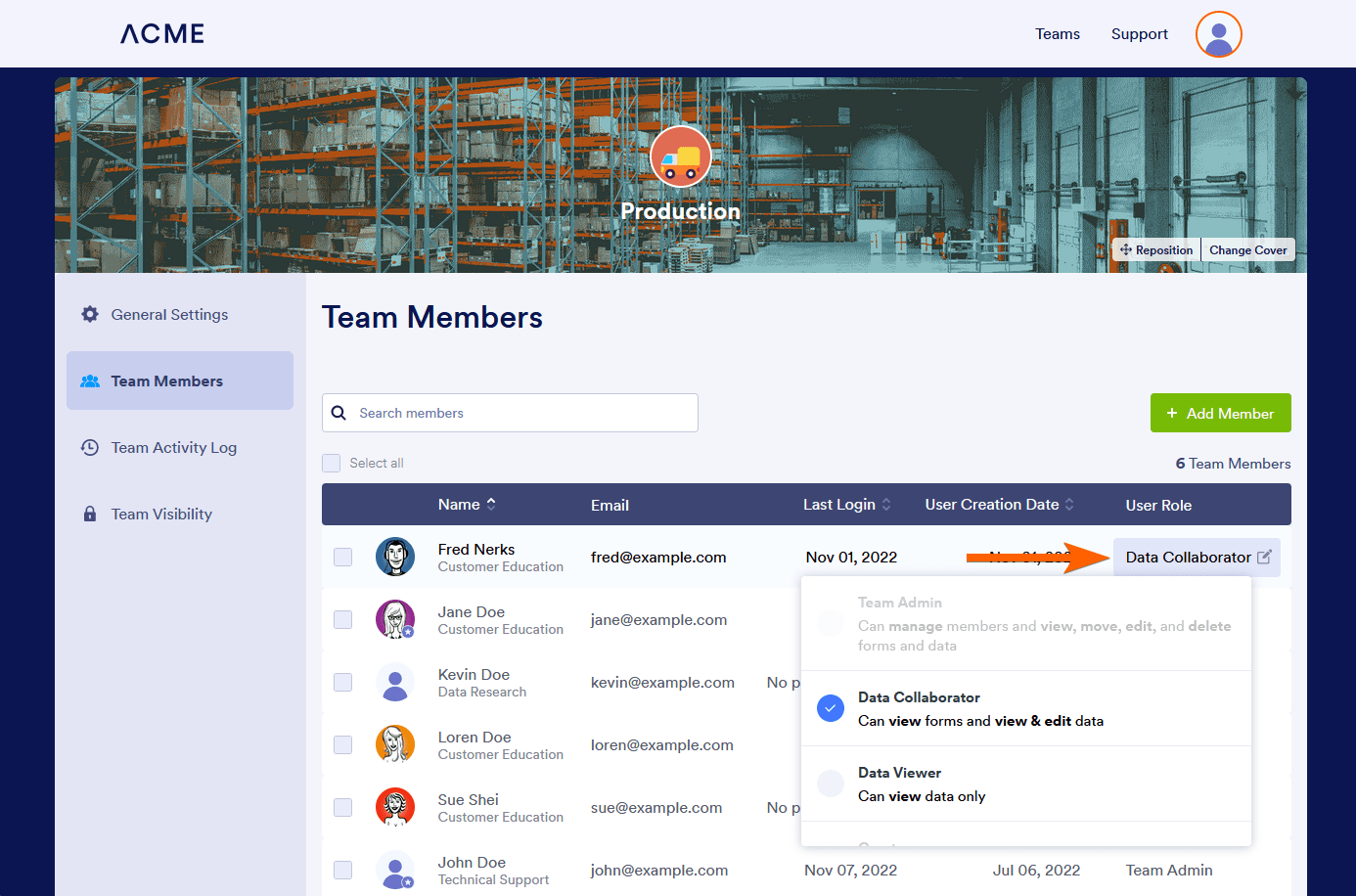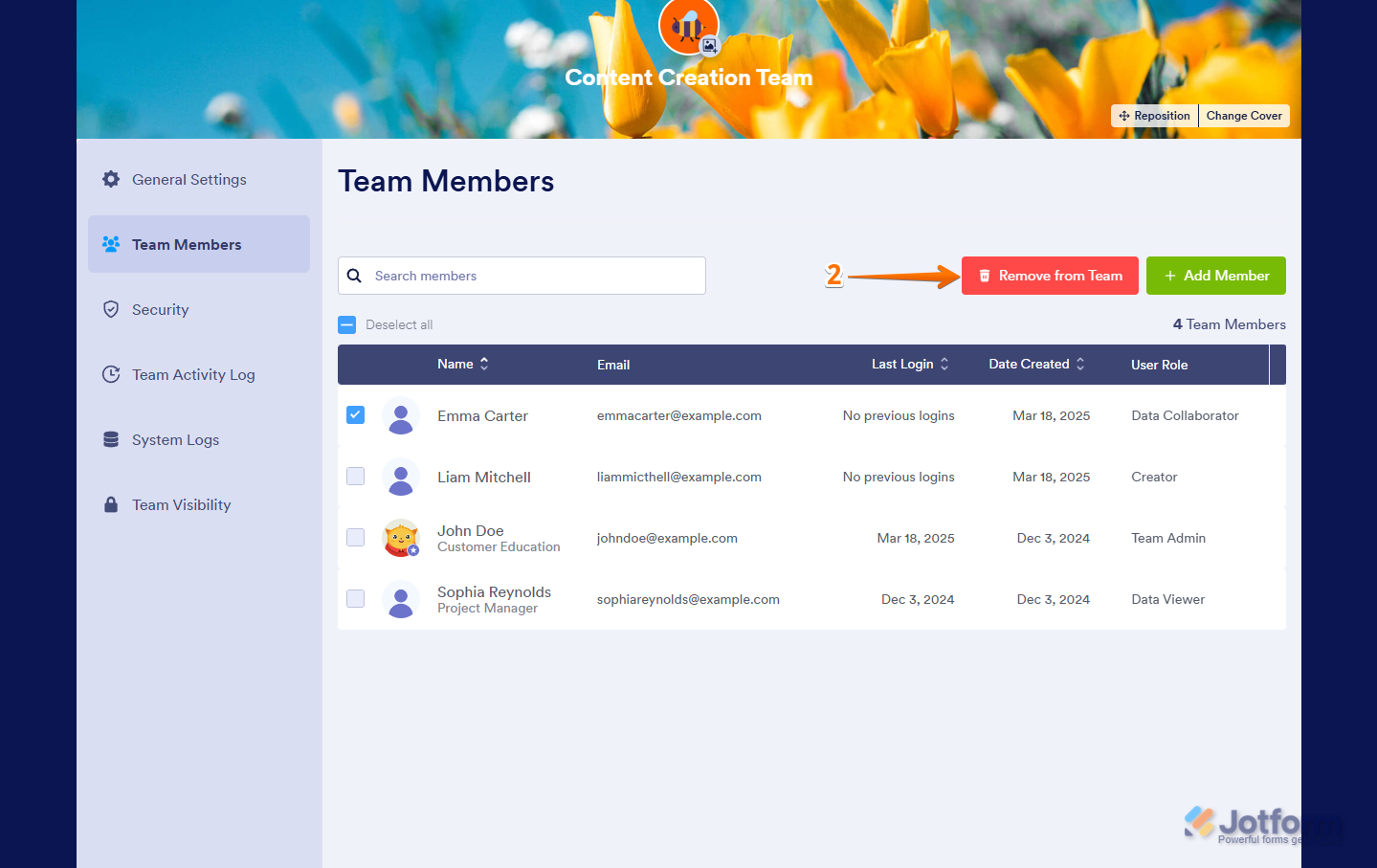 As a Jotform Teams admin, you have full control over managing your team members. You can update their roles or remove them as needed to keep your team organized. You can manage team members through your My Workspace page, Team Workspace page, and Team Settings.