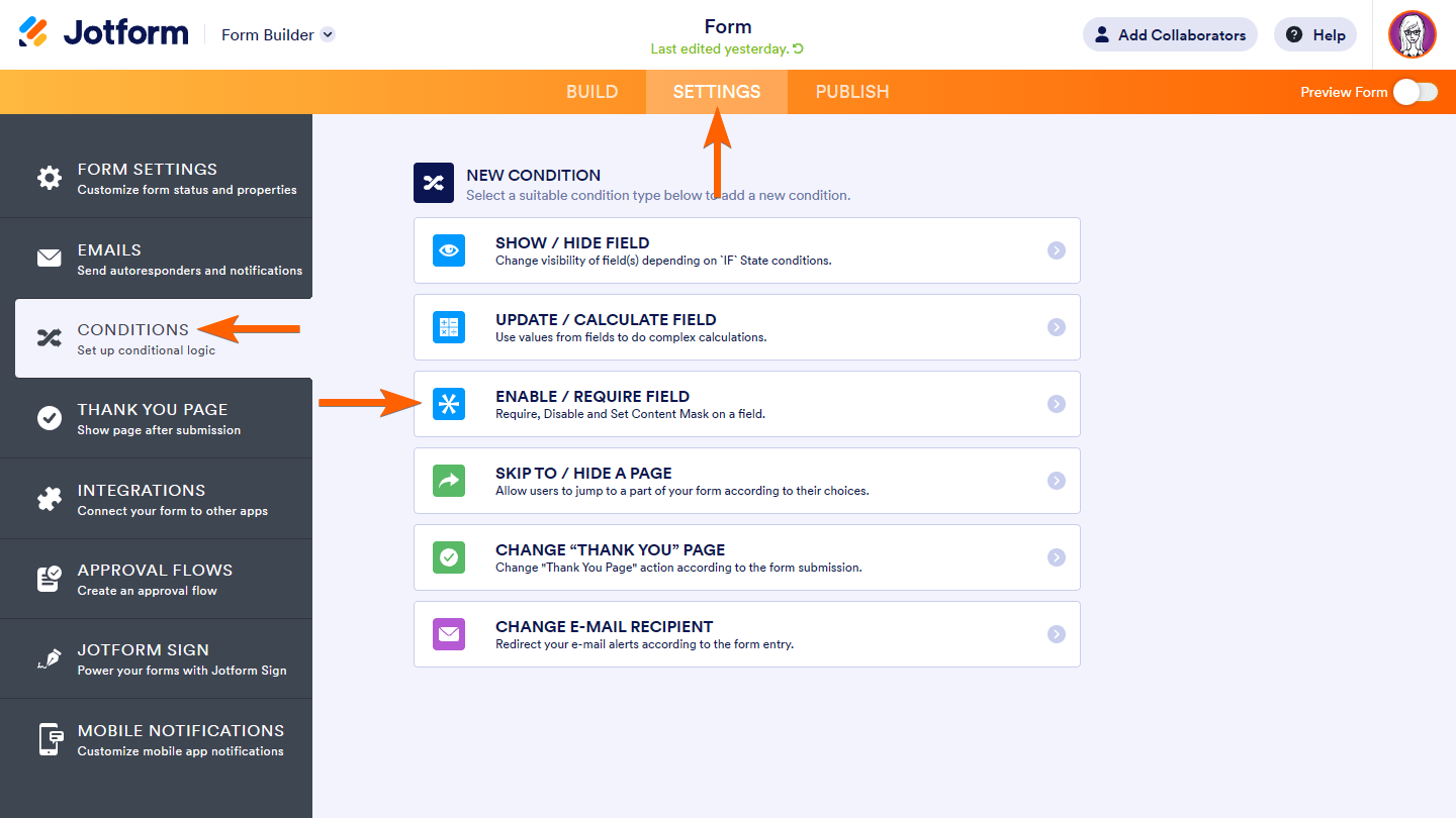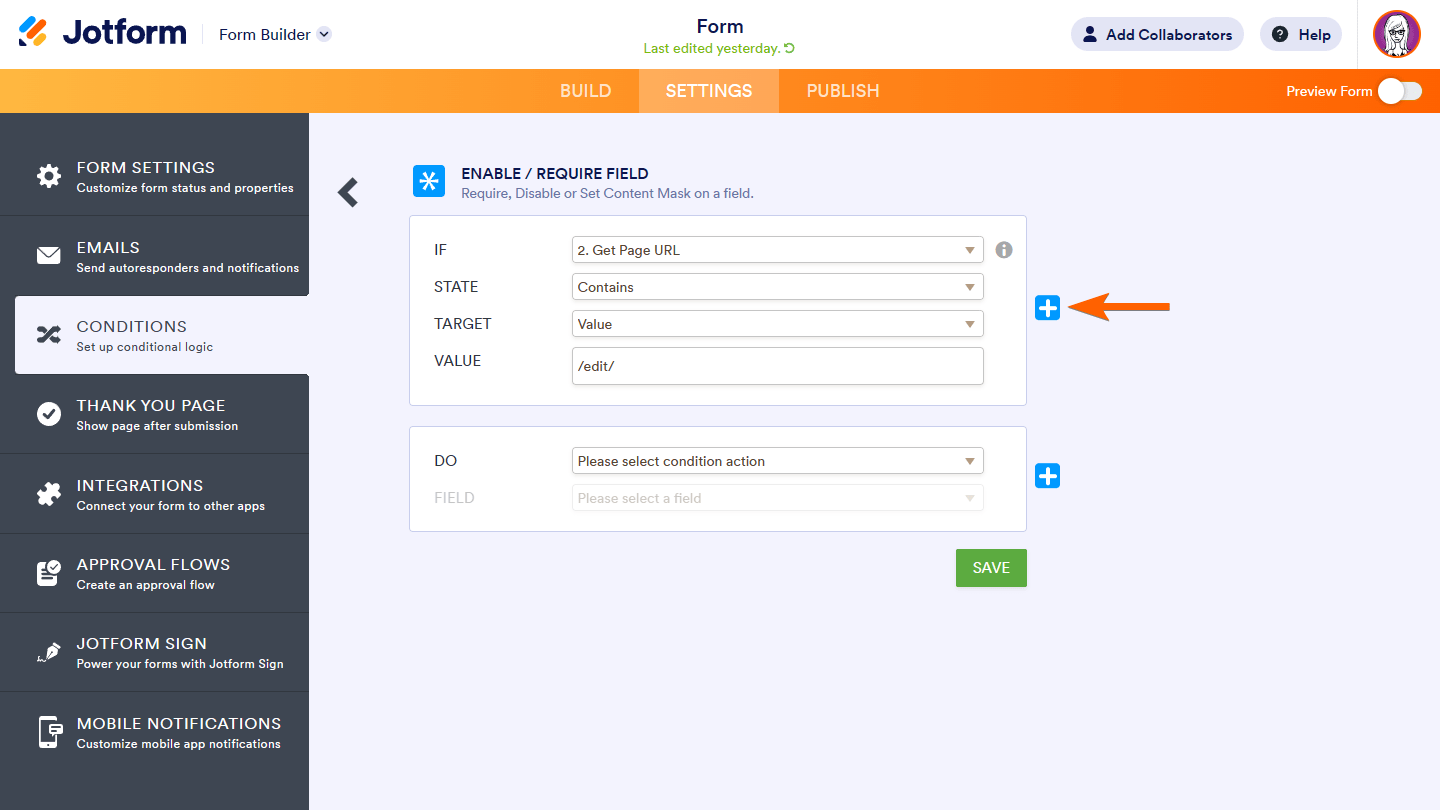 - Select Conditions on the left and create a new Enable/Require Field condition.