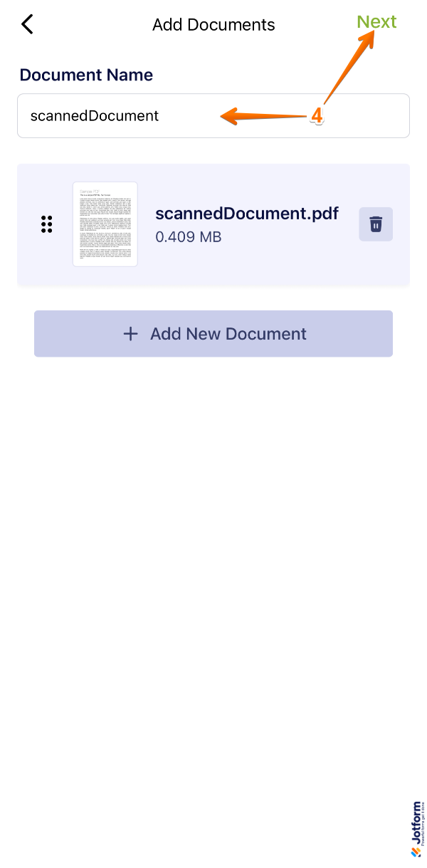 - Once you’re done scanning your document, enter a name for it in the Document Name field, and then tap on Next in the top-right corner of the screen.