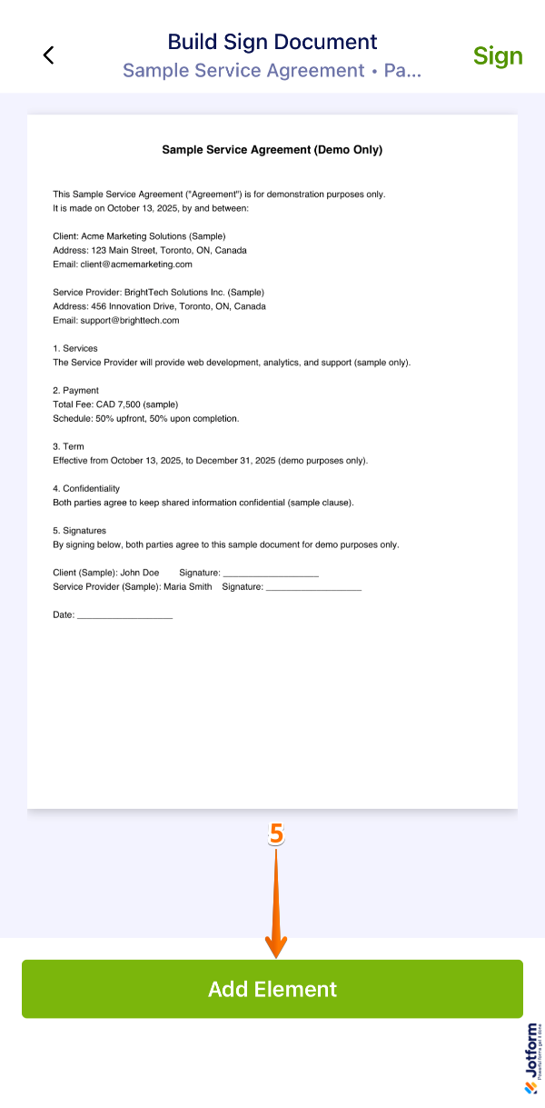 - After adding the elements, in the top-right corner of the screen, tap on Sign.