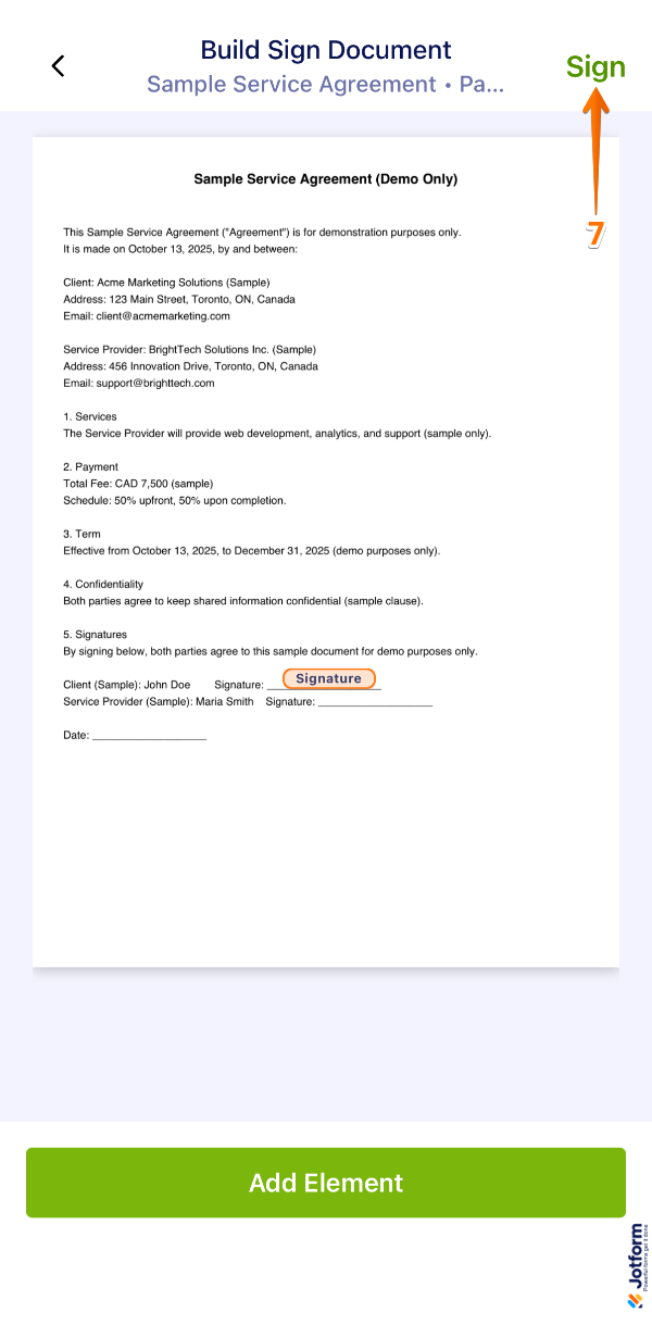 - After adding the elements, in the top-right corner of the screen, tap on Sign.