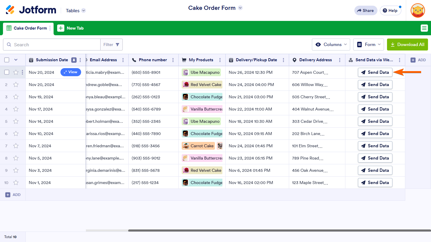 The Send Data via Webhook action button allows you to send submission data to a webhook endpoint. You can push data to your own or third-party services directly from Jotform Tables.