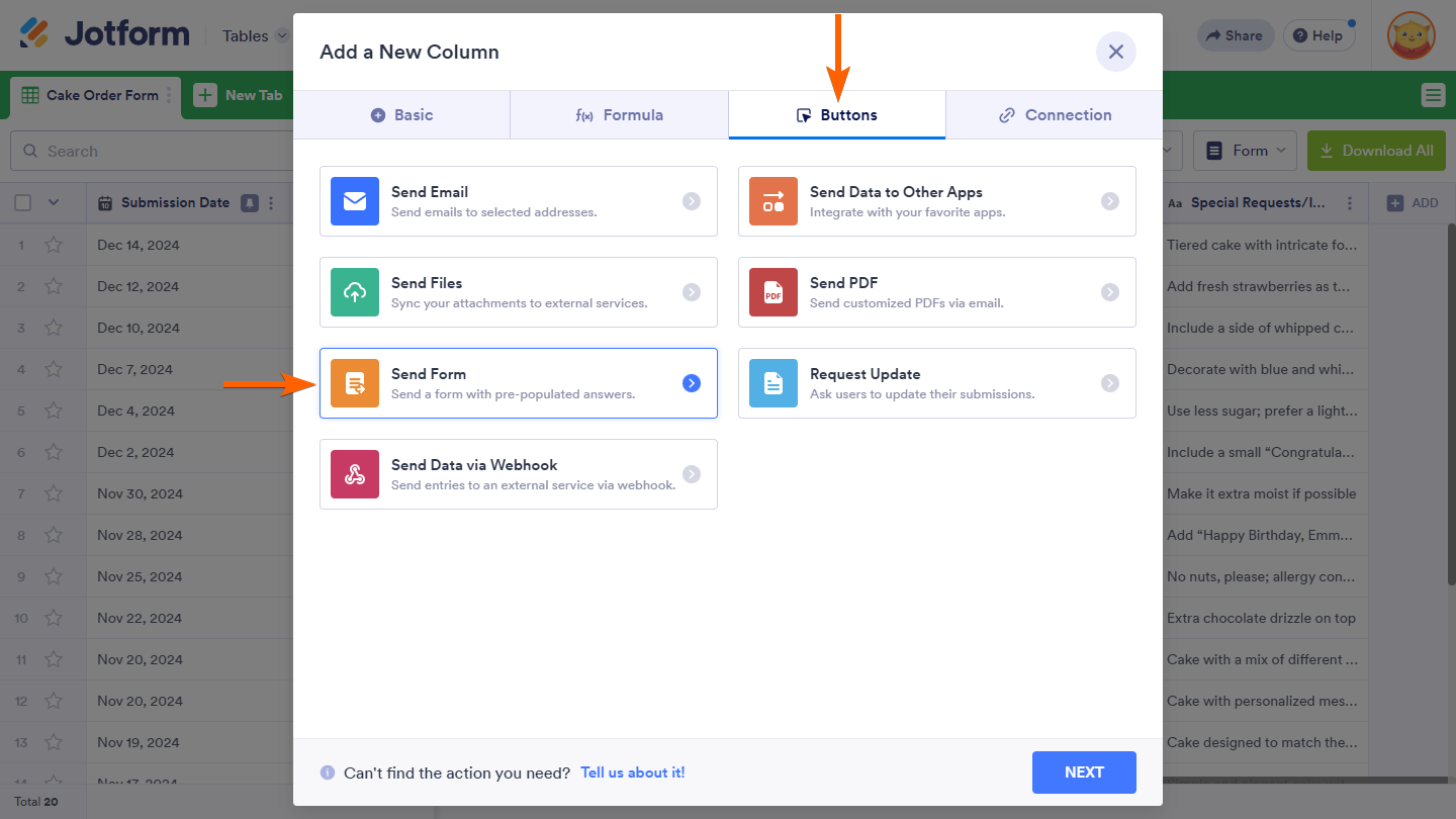 Use these steps to add a Send Form Action Button column to your table: