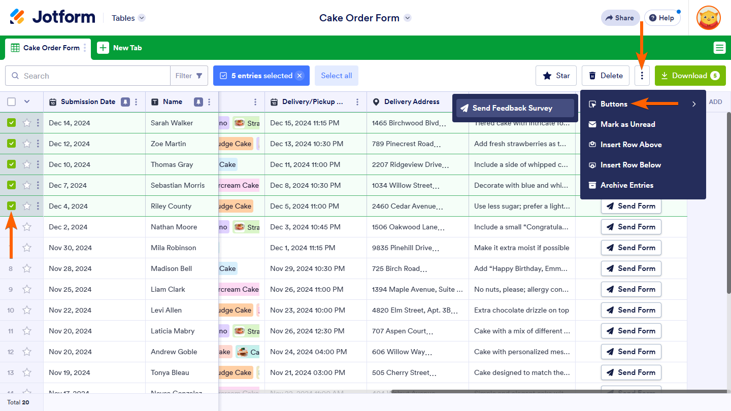 Jotform Tables also let you send your form for multiple entries simultaneously, saving time and ensuring consistency. To do this, select multiple entries in your table and click on the Three Dots icon at the top. Then, hover over the Buttons option to open a submenu and select the option for the Send Form button you’ve set up. This method can also be used to resend the form for multiple entries at once.