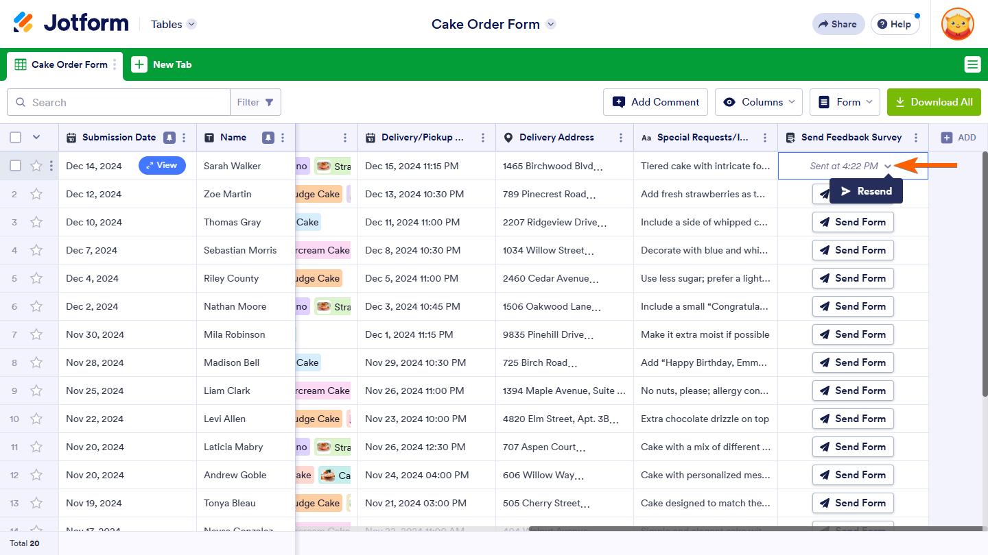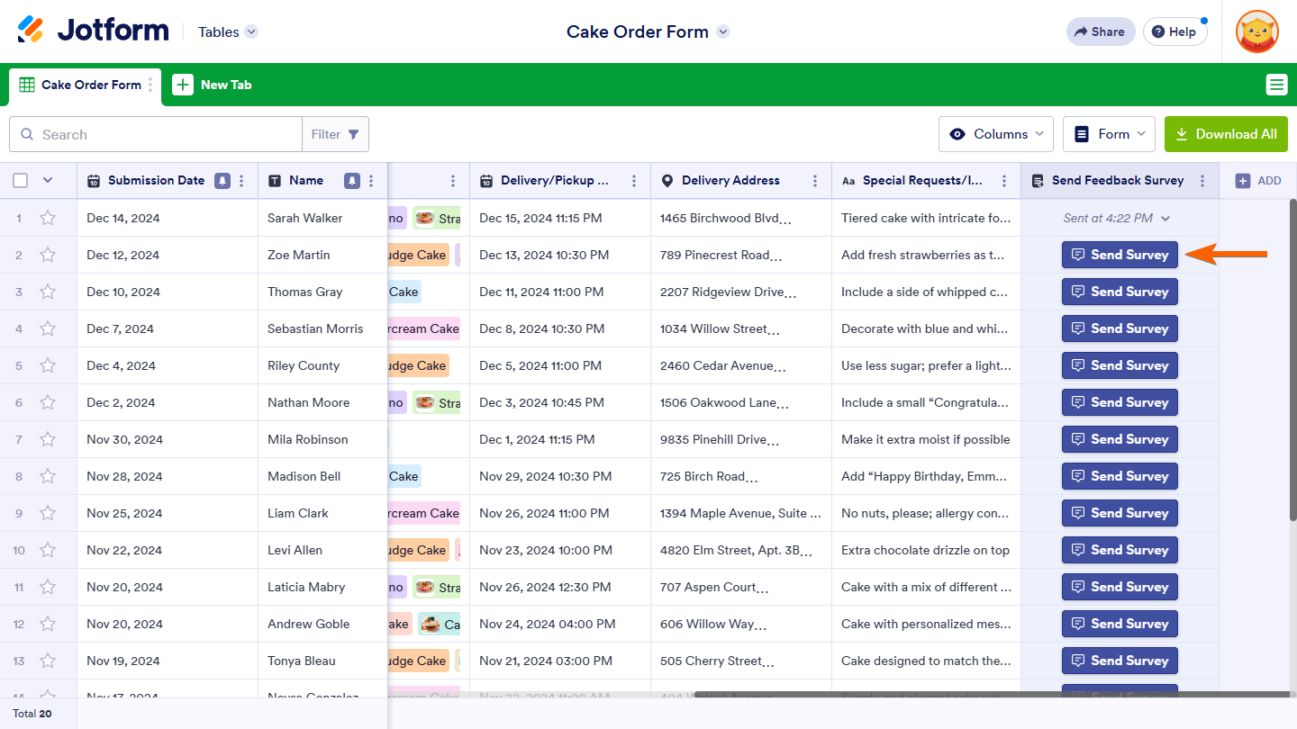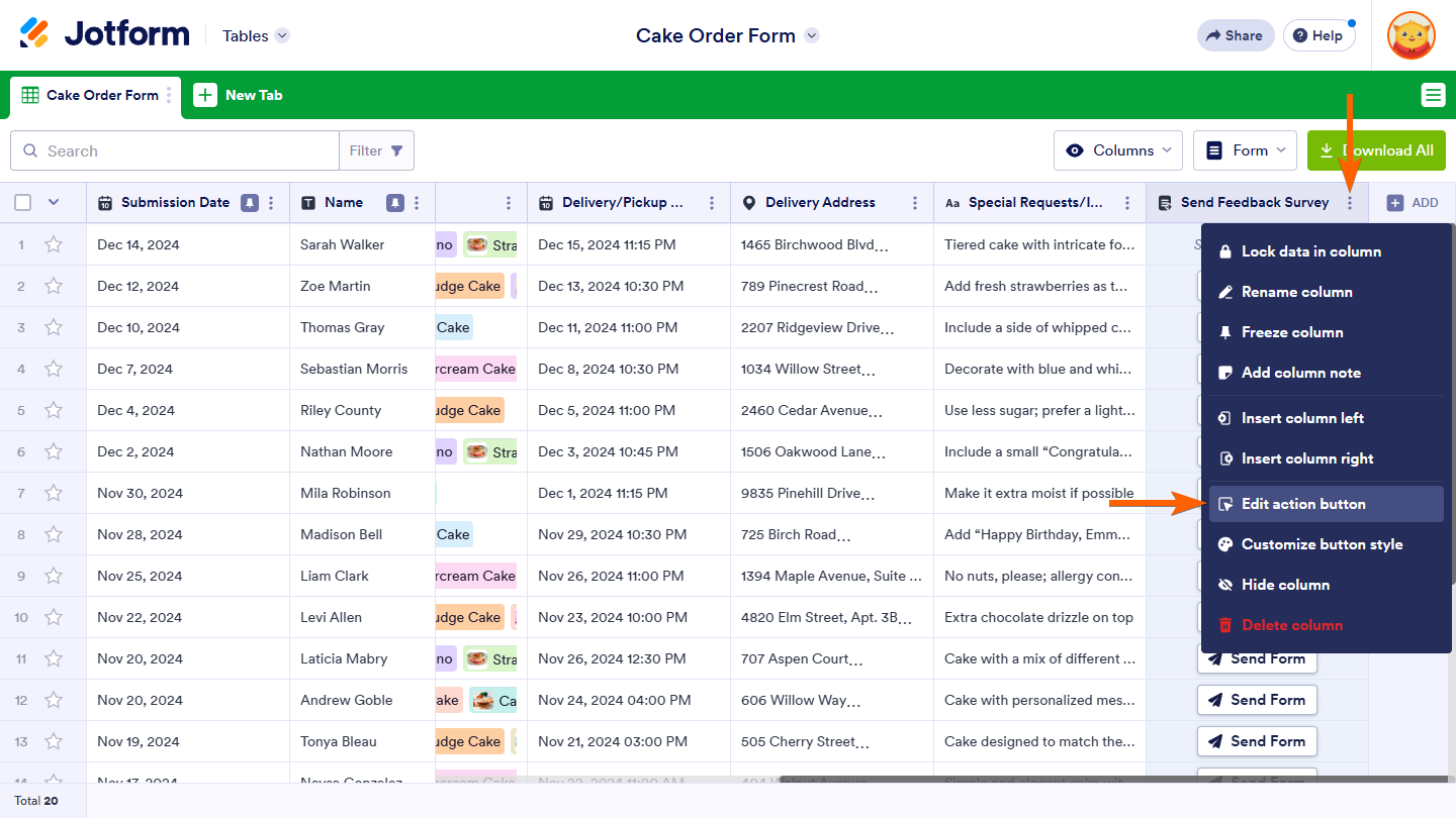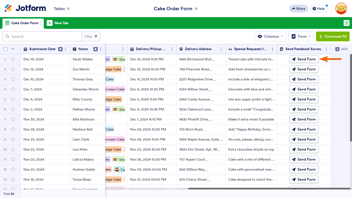 You can customize the appearance of the Send Form button in your table. If your table includes other action buttons, styling the Send Form button can make it easier to distinguish from the rest. For more details, see How to Customize Action Buttons in Jotform Tables.