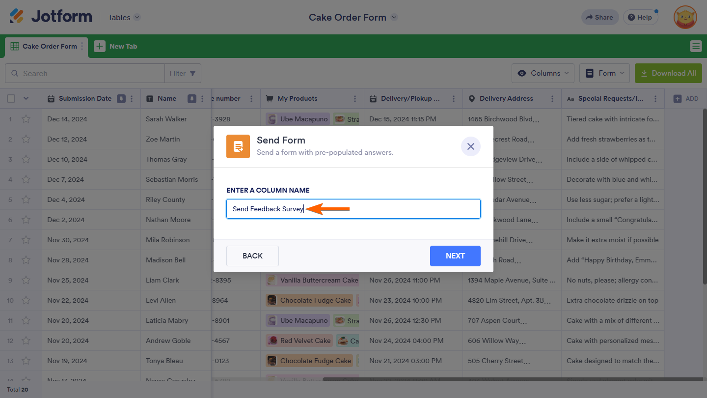 Jotform Tables lets you send forms in your account directly to form respondents. By setting up the Send Form Action Button column in your table, you can email forms with prefilled fields using data from your table manually, making it convenient for respondents to complete additional forms. For instance, you could send a prefilled feedback form to event attendees based on their registration data, email a service update form to customers with their contact details and past service requests already included, or share a survey with team members prefilled with project details. This feature is ideal for follow-ups, gathering more information, or sharing forms based on previous submissions, ensuring your forms are relevant and easy to complete while improving engagement and data collection.