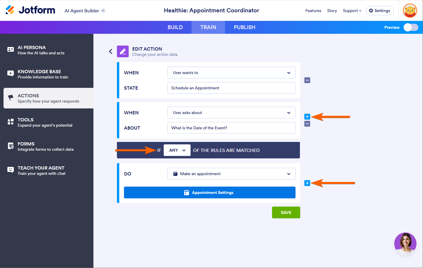 The Plus Sign icon next to the condition and action in the Actions section enables you to define additional instructions for your agent within a single action. You can add multiple conditions and specify whether ANY or ALL must be met to trigger the action. Additionally, you can add multiple actions, which will be executed simultaneously when the condition is met. For more details on each available predefined condition and action, see How to Customize Agent Actions and Triggers.
