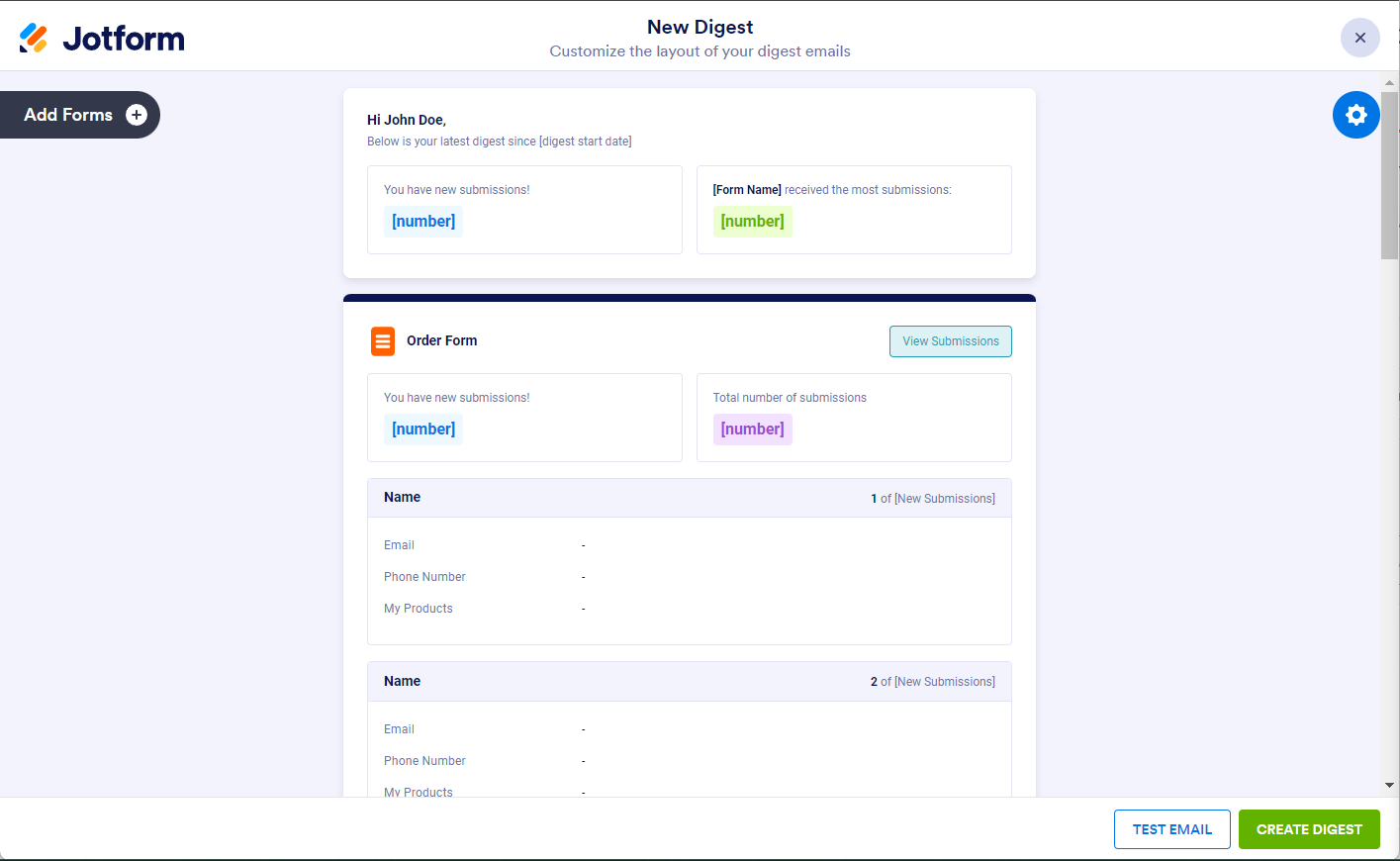 You can select multiple forms to create a Digest Email for at the same time.