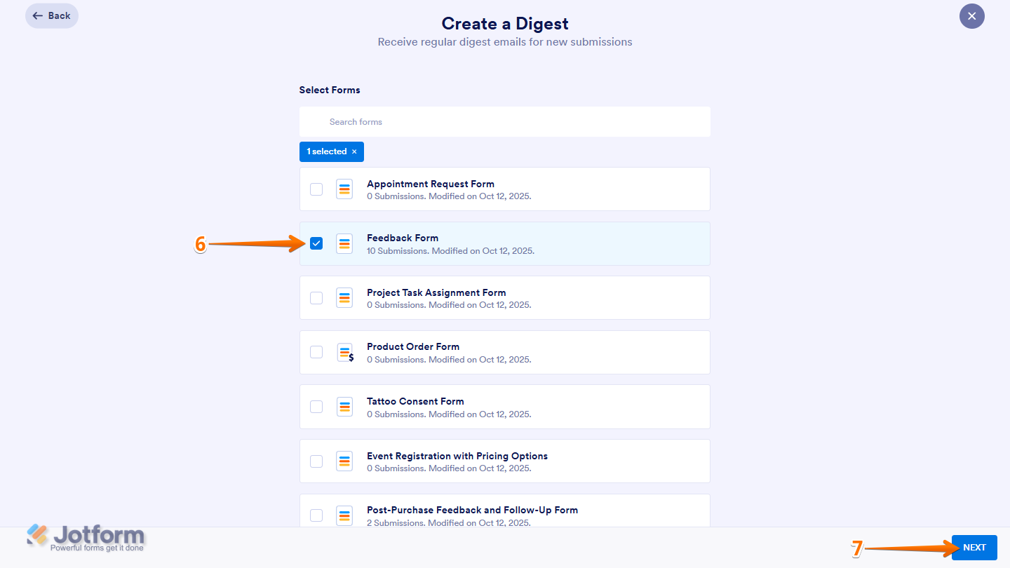 - Now, select the form you want to create a digest email for. For example, Feedback Form.