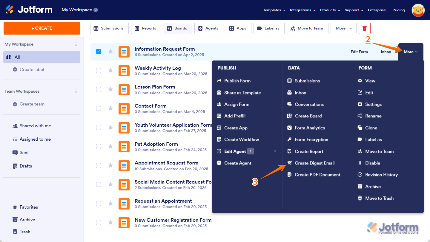 The quickest and easiest way to create Digest Emails is from your Workspace page. You can either select multiple forms at once or start with just one. Here’s how to do it: