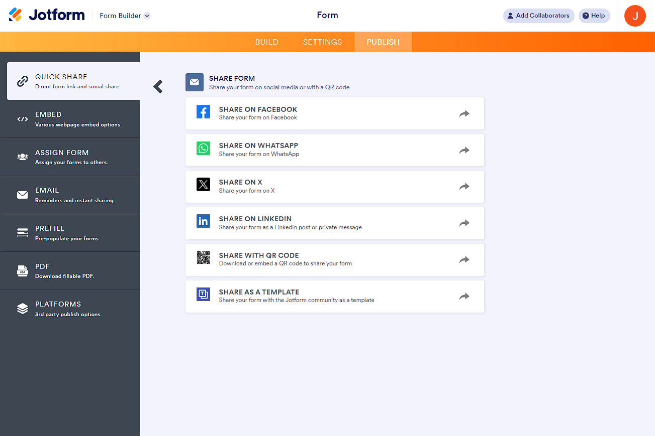 Jotform provides a few embedding methods for various platforms. You can choose the Javascript, Iframe, Lightbox, Popup, or Feedback Button. Sharing your form links on different social media sites is also possible.