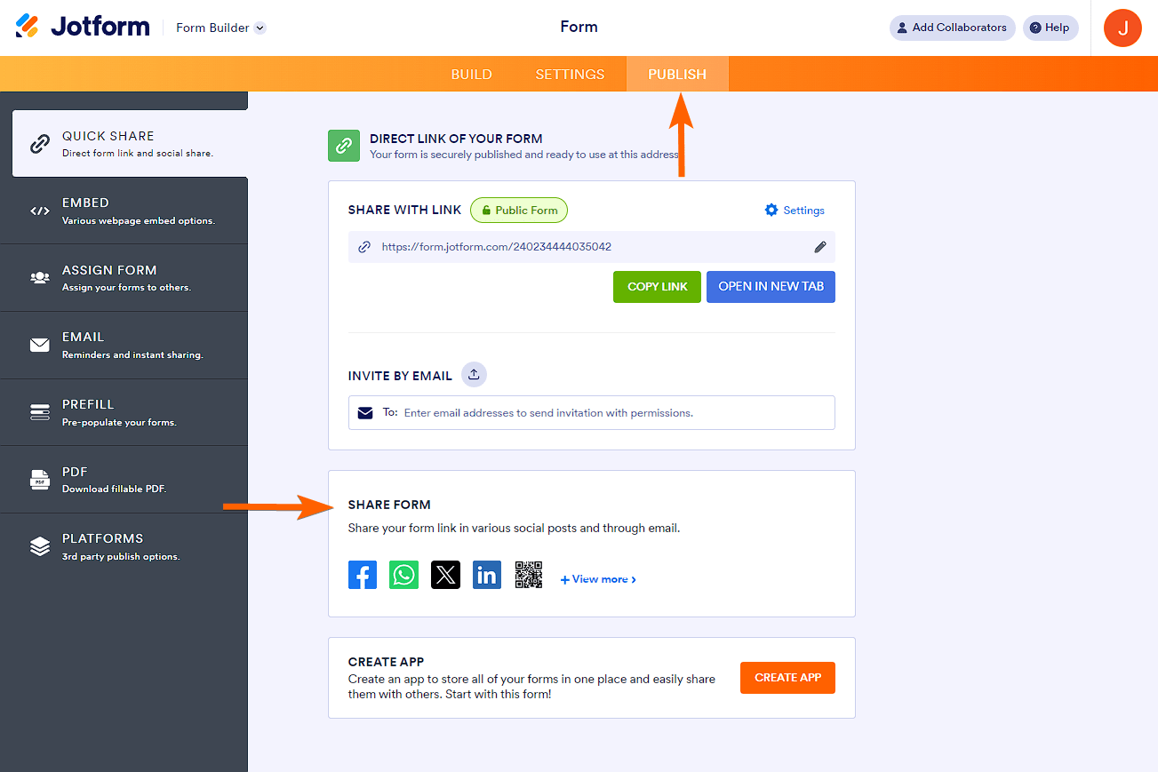 - In the Form Builder, go to the Publish tab. You’ll automatically see the Quick Share page.
