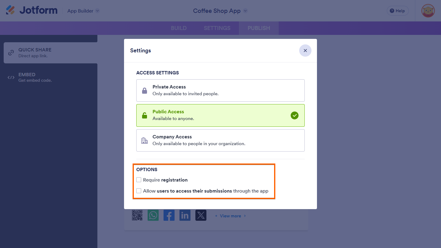 On the Publish page, you can choose three access options to choose from for your store link: Public, Private, and Company Access. By default, links are set to public access. Click on the Settings button at the top right corner of the App Link box to change the access type for your store link.