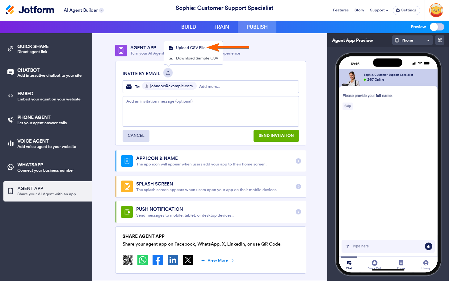 The AI Agent Builder allows you to turn your AI agent into an app, providing a more personalized and accessible experience for users. With the Agent App section in the Publish tab, you can share your agent via a direct link, email, social media, or QR code.