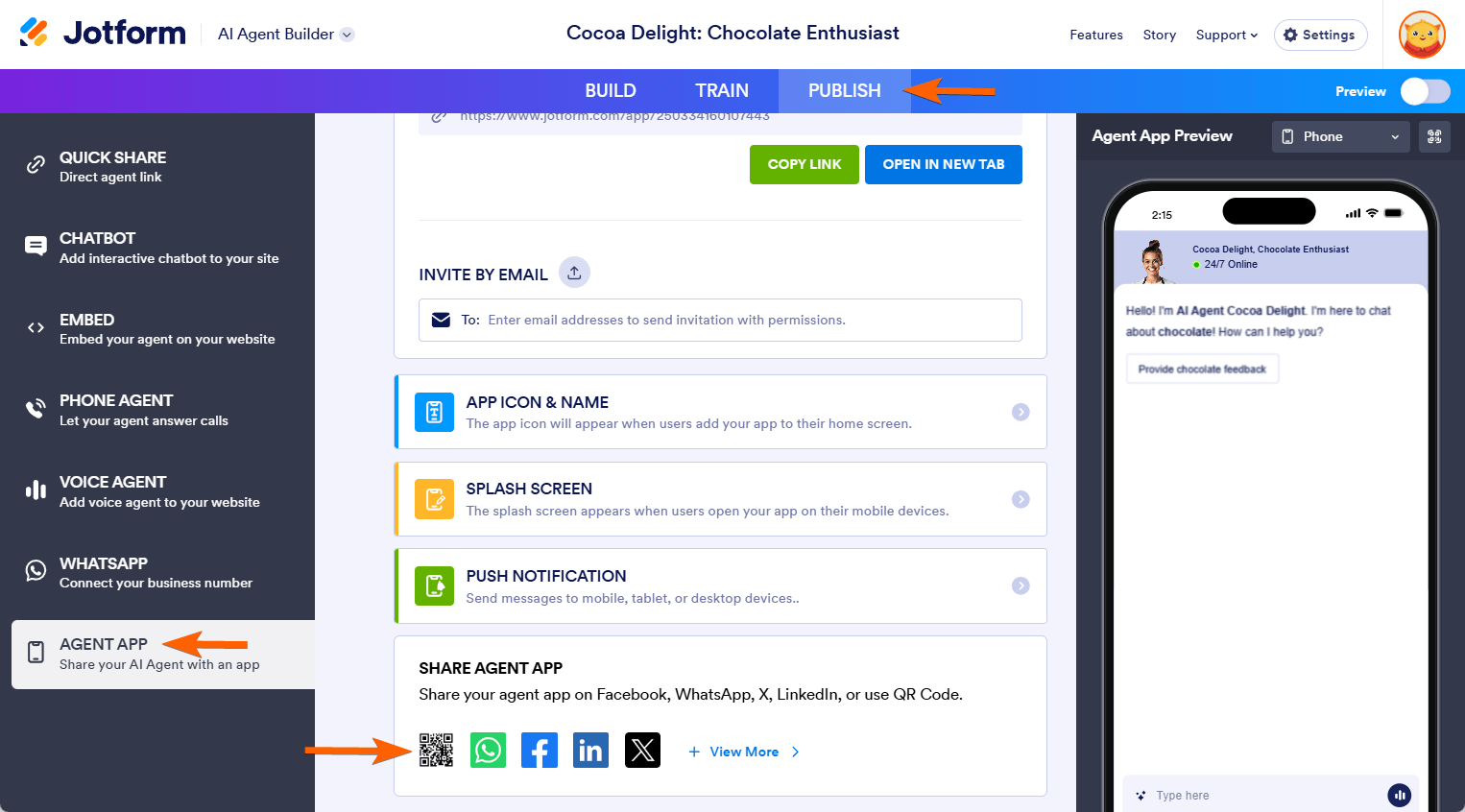 You can share a QR Code of your AI Agent app and make it accessible and installable on your user’s devices. Here’s how: