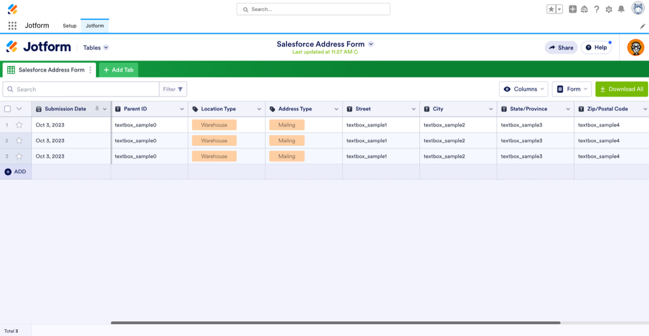 Even though using Jotform in Salesforce AppExchange to collect contacts will be the most efficient way to keep your data in one place, having a backup option never hurts. You can even add your own rows and columns to help keep track of contact submissions.