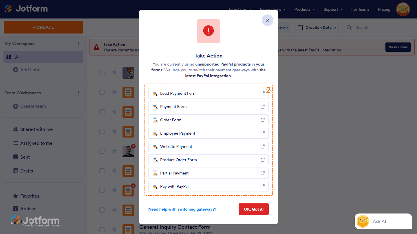 You don’t need to delete your payment gateway to switch it. *If you delete it, all the data linked to that payment field will be lost.