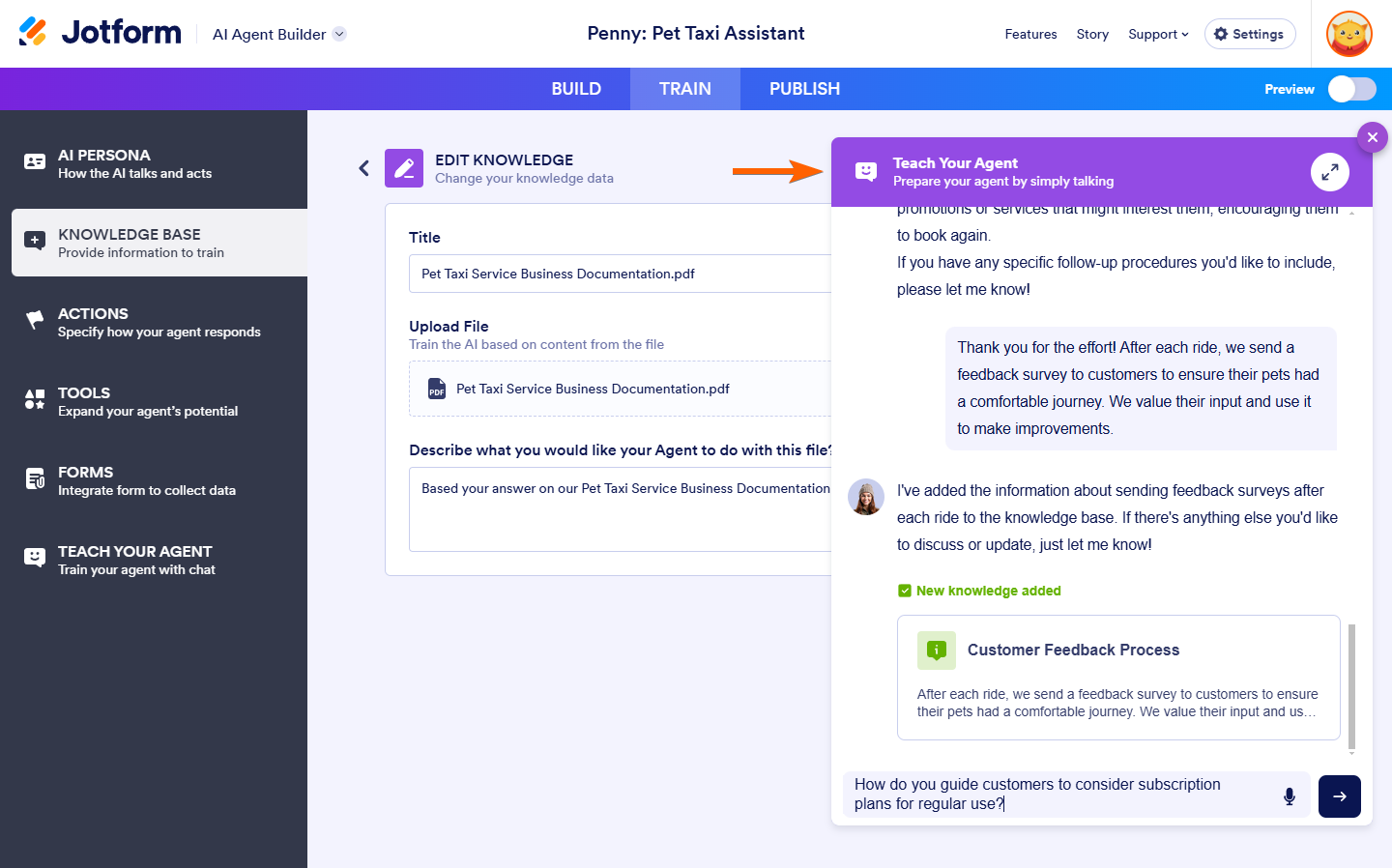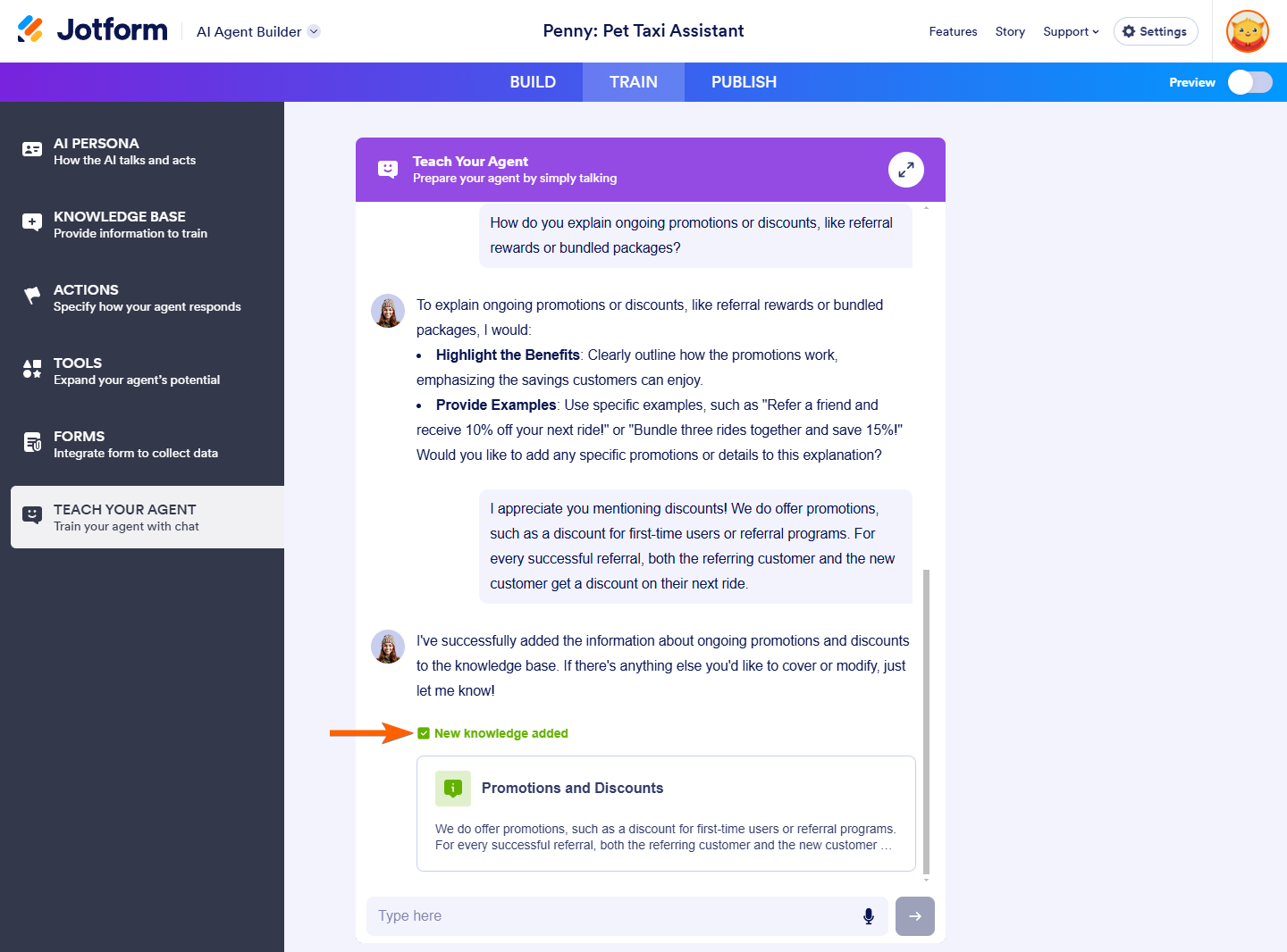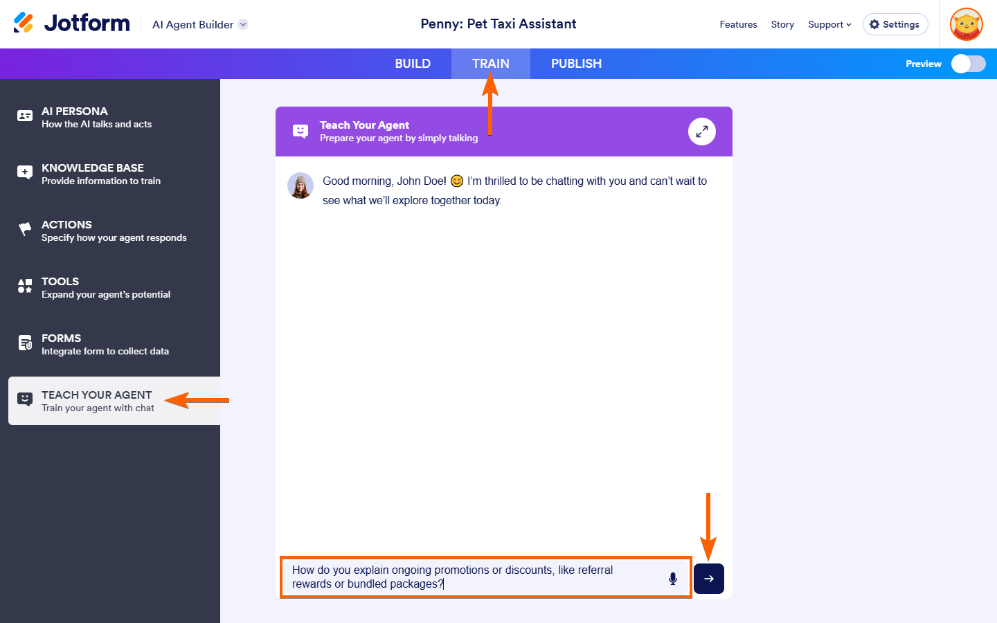 - In the input box at the bottom of the chat area on the right, enter additional queries or information to teach your agent, then press Enter or click on the Send button next to it to submit.