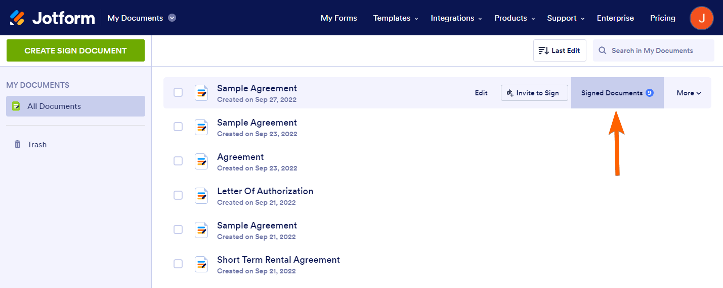 - Go to the My Documents page, and hover your mouse to one of your Jotform Sign documents.