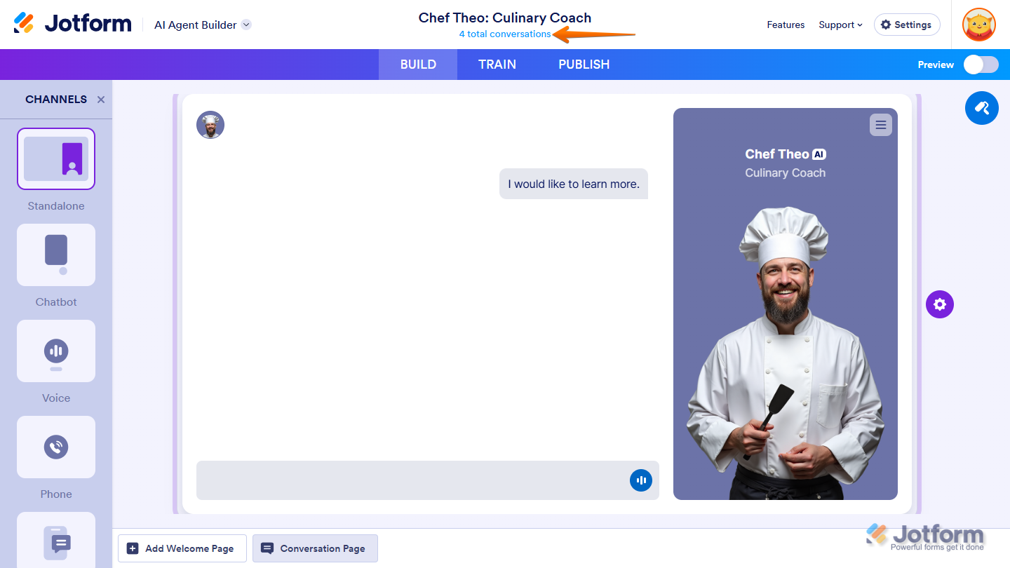 You can also open the Conversations page while editing your Presentation Agent in AI Agent Builder. Here’s how to do it: