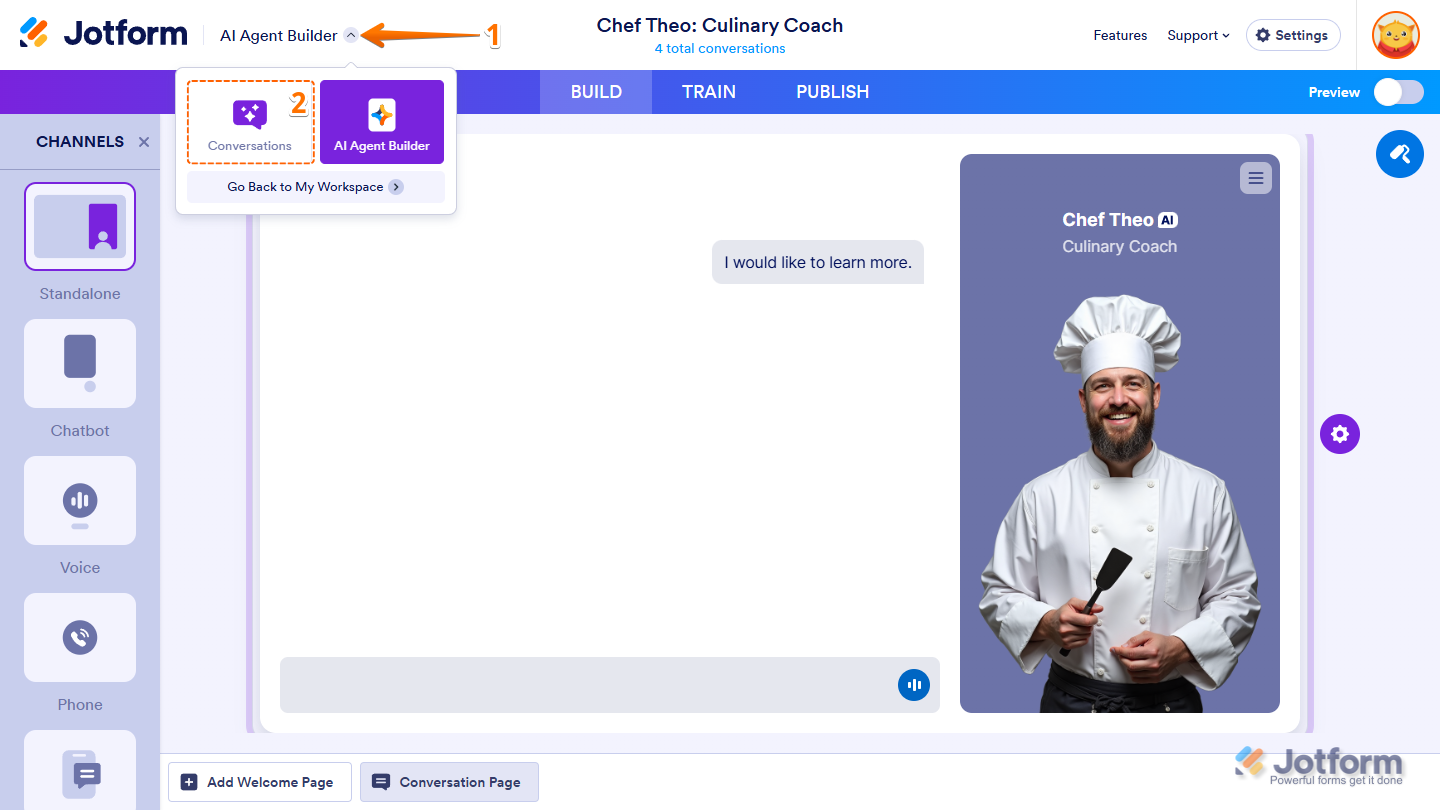 - In AI Agent Builder, click on the Downward Arrow icon next to the Jotform Logo in the top-left corner of the page.