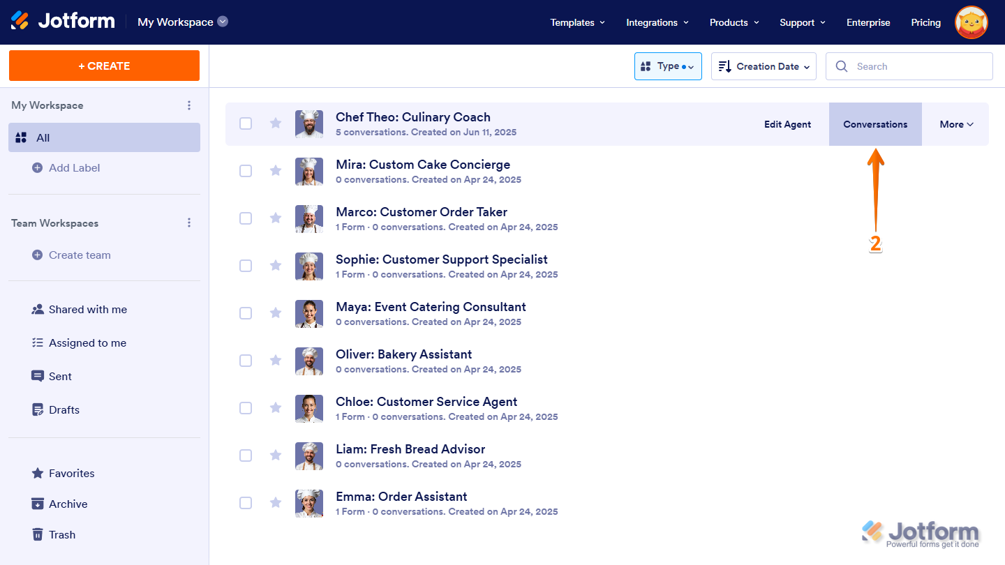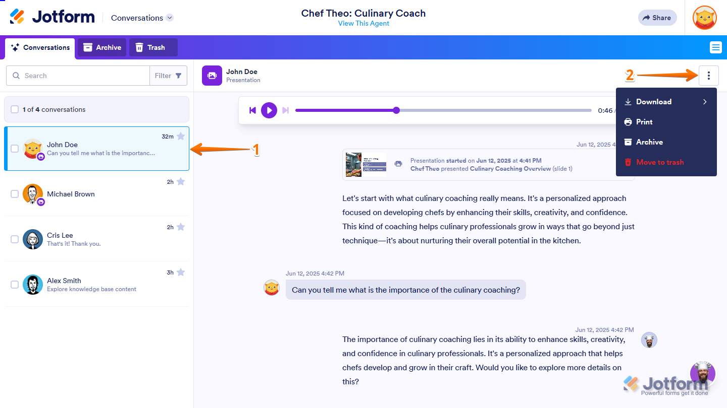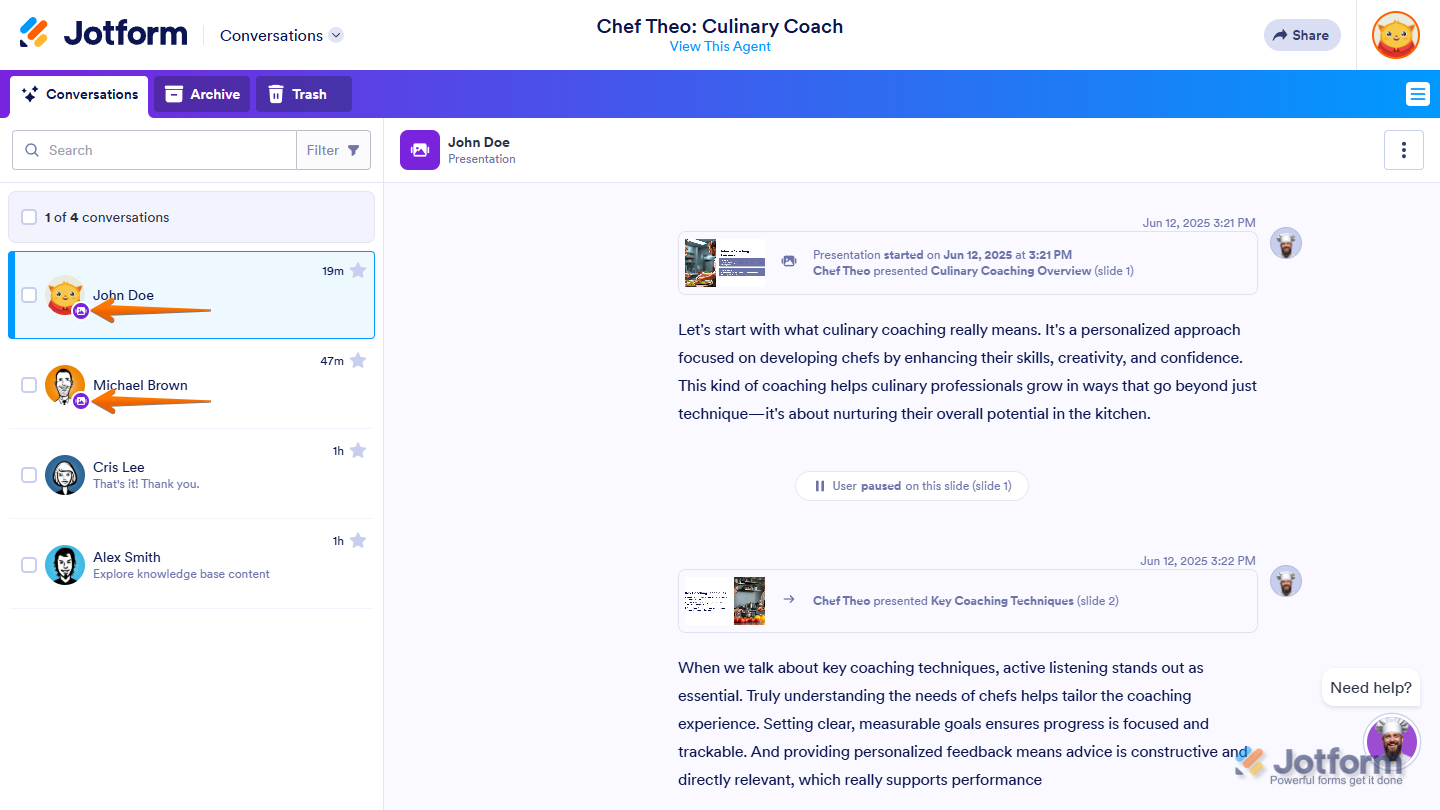 With Jotform’s Conversations page, you can easily track how users interact with your AI Presentation Agent. This helps you understand what captures their attention, where they drop off, and what questions they ask. Each session includes a complete engagement record, giving you the insights you need to improve both your content and your agent’s responses. In this guide, you’ll learn how to: